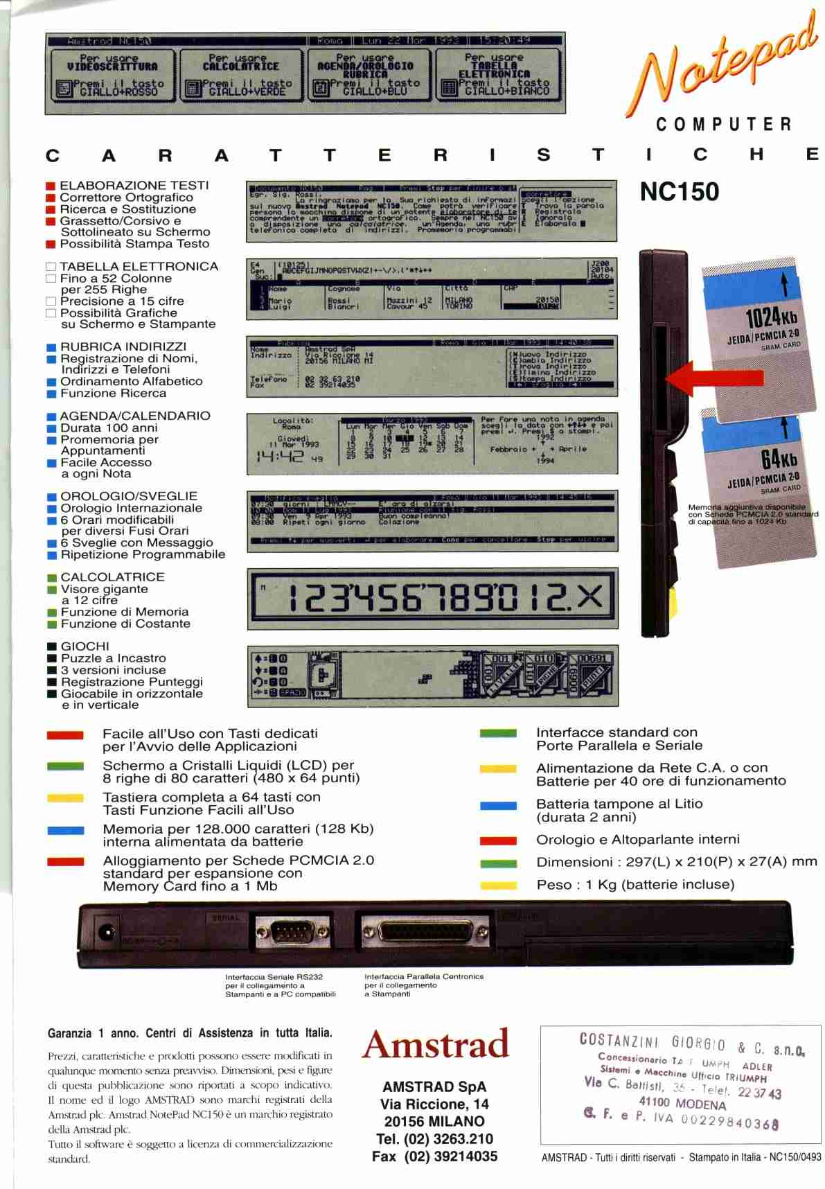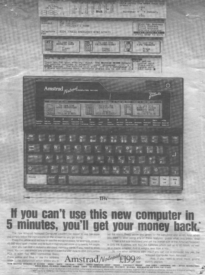 To achieve this ease of use, the design of the Amstrad Notepad and Notebook computers includes coloured keys for accessing their major functions. Another useful feature for the new computer user is the 'Stop' button that will cancel any action that the user does not want to happen. Although easy to use, the Amstrad NCs should not be underestimated-- they all have advanced features such as spell checking and mail merge in their word processor software, and even allow you to program them using the BBC BASIC programming language.