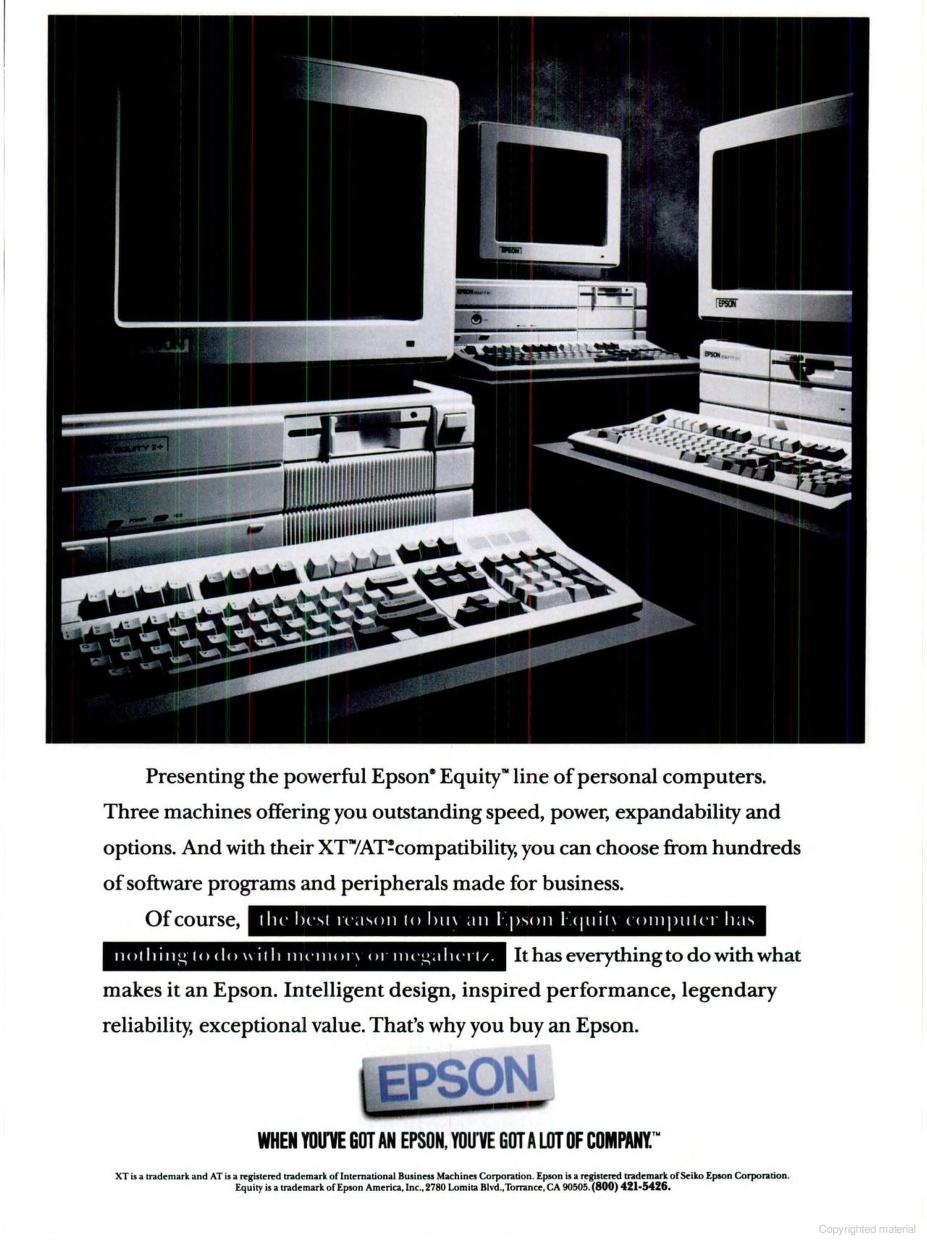 Epson entered the PC-compatible market in 1985 with the Equity series. Already well-known for their dot-matrix printers, they went on to produce 11 PCs in the series, including some laptops. All Epson PCs were highly regarded as being very well-built and had good specifications for the price. Just as with IBM, these machines had evidence of being over-engineered (a good thing!).