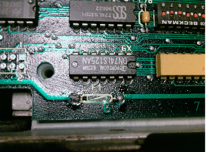 The keyboard connected to the computer via a 9-pin female D-SUB at the lower back of the computer. It is powered by +12V DC. Protection of this power is entrusted to a small 2A fuse on the computer's motherboard here: