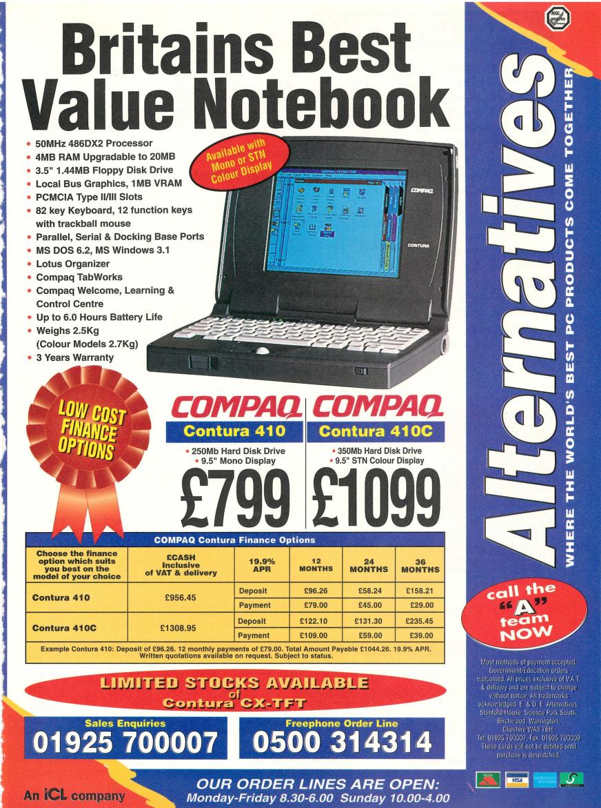 | Ambra | 486SX-25 | Sub-notebook. 4 MB RAM, 170 MB HDD, external 3.5" floppy, hi-res VGA LCD display, PCMCIA II slot, integral trackball, parallel and RS232 ports, DOS 6.2 and Windows 3.1. Carry case. £699 exc. VAT |