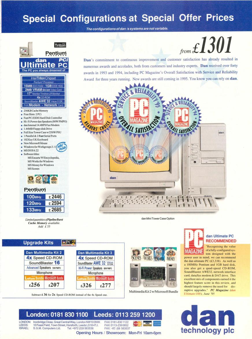 | Dan Technology | Ultimate PC | Pentium 120 MHz, 16 MB EDO RAM, Intel Triton chipset, 1 GB EIDE hard disk, 2 MB VRAM video card, 17" Trinitron LR monitor, 4xCD-ROM, Sound Blaster AWE32 Value 512 KB, Fax/modem, Network card. Includes DOS, WFWG3.11, MS Works, MS Money. £2,594 exc. VAT. For Pipeline Burst Cache memory, add £55. |
