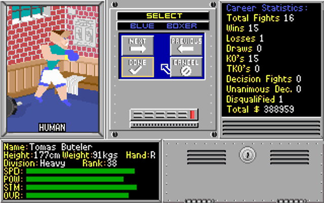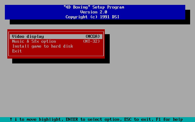 1.0 (Mindscape version) Jun 1991 First release. Intro shows the Mindscape logo followed by "4D Sports(TM) Boxing". Main menu music and Hall of Fame are completely different (and better IMHO). NumLock should be on and use the keypad to navigate. The separate arrow keys don't appear to work well for navigation.