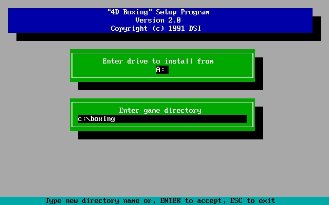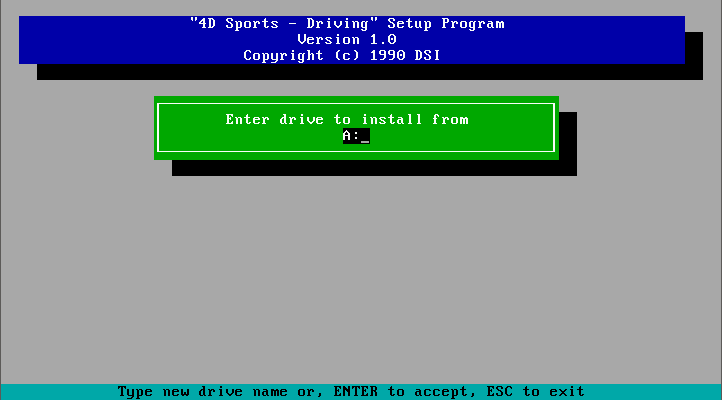 The game can run from floppy disk but is better to install it to your hard disk, especially if you have the 3.5" disks, since there are two of them. If you do so, only a single disk swap is needed (from Disk 'A' to Disk 'B'). Unfortunately, whilst the setup program does include an option to install to a hard disk, when selecting where to copy from, only actual floppy drives that are detected are allowed, not directories. This is only a problem if you're trying to install from, say, a temporary directory on your hard disk to a final "installed" directory. You cannot install from and to the same drive letter, but it may work if you install from C: to D: for example.