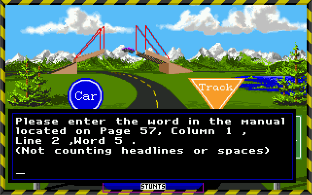 Cracks do exist that bypass this check, but if you prefer to run a non-cracked version of the game, click here for a PDF containing the words for 4D Sports Driving v1.1 (Mindscape), or look below for the words for Stunts v1.1 (Broderbund, 2/12/1991):