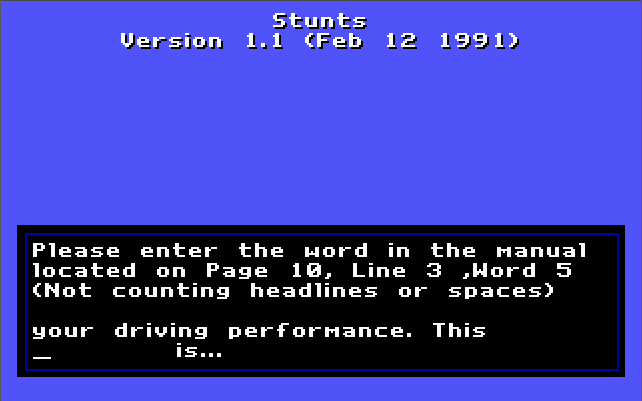 The game has manual copy protection. Given that there are two distinct releases of the game (Mindscape and Broderbund), both have a different manual, though the copy protection has the same premise - at the start of your first race you will be prompted to enter a word on a specific page, line and word number. Bear in mind the manual for 4D Sports Driving has multiple languages so you might be asked to input a word from any of these languages. For the Stunts release, it gives you a helpful hint by providing most of the sentence in which the word resides.