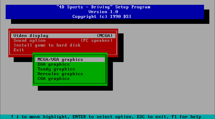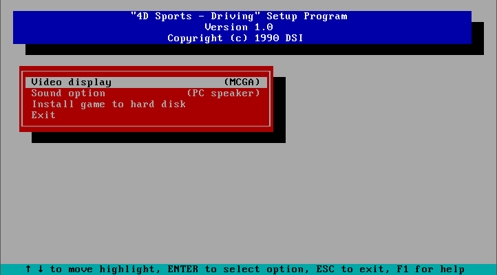 "4D Sports - Driving is best played in MCGA mode, which provides 256 colours (though it doesn't use a full colour palette, it's still slightly better than EGA). Sound Blaster audio is the best option for music and sound effects, and the game will run at a decent frame rate if you have a 386DX-16 or faster. Having a mouse driver loaded will make menu navigation easier in the replay mode and track editor. While racing, the keys work just fine, but I find a decent-quality arcade analogue joystick with a short stick is best. Switch off the music using CTRL-M if it gets annoying."