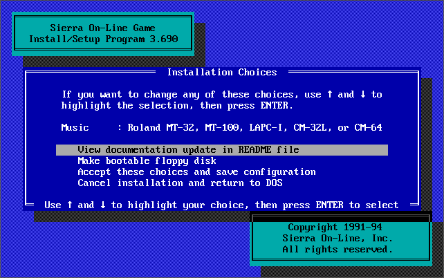 As mentioned further up, INSTALL detects if it's been run from drive A: or B: and if so it will automatically think you want to install the game to your hard disk and start that process. If it detects it's been run from a hard disk it will go into 'setup' mode as if the game has already been installed.