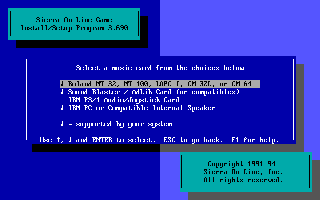 Audio support for PC speaker, PS/1 Audio Card, Ad Lib, Sound Blaster, Pro Audio Spectrum and Roland MT-32/LAPC-I.