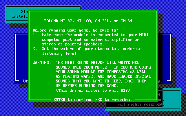 Symptom: I have configured the game for my Roland MT-32, but the sounds are very off!