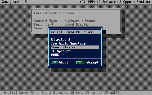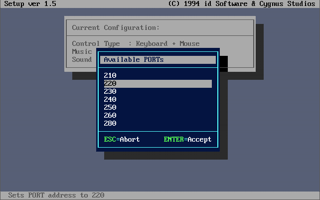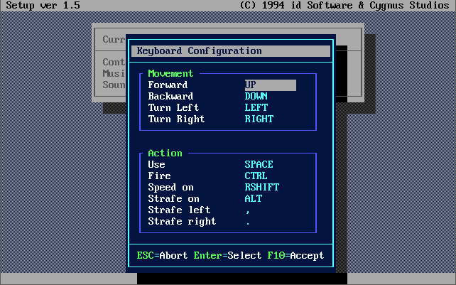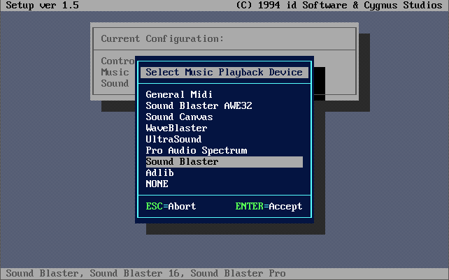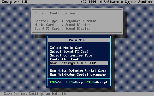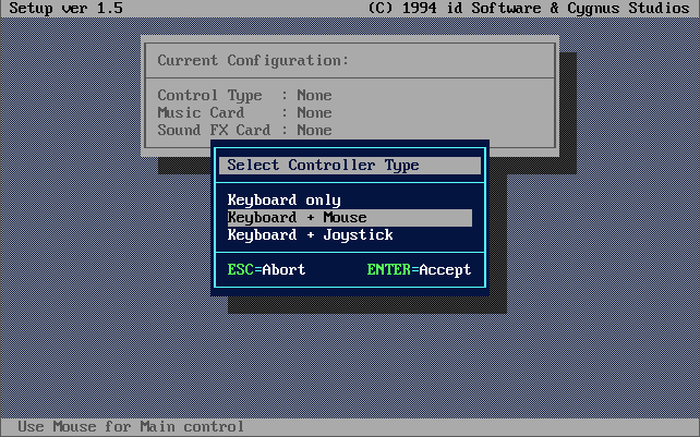 Immediately after installation is complete, the SETUP utility is run and takes you through controller, music and sound effects setup options: