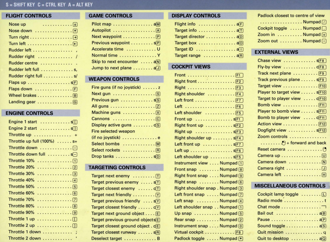 | 1.1 | January 1999 | First official MicroProse patch. Must be installed on top of v1.0. Often used for its much more difficult enemy A.I. (harder than v1.2 below). But lacks some features and multiplay bug fixes that are in v1.2. Among other things: 1. New "wing-leveler" autopilot mode added. This function (SHIFT-A by default) will maintain current altitude, heading and speed. 2. Bailouts are modeled more realistically. Depending on the aircraft's orientation, speed and G-forces (level and slow is best), there is a chance for parachute failure, or for various levels of injury (hitting the aircraft) during egress. 3. Ground collision is revised to better permit gear-up landings (ditching). 4. Problem with virtual cockpits on cards not supporting 8-bit textures (such as Riva 128) is now fixed. 5. AI pilots will now properly perform ground attacks when ordered. 6. Ground control and AI squad leader use better logic for ordering retreats. 7. Bombers defensive logic is improved. Tail-gunners have improved bogey-tracking ability, and dive-bombers use proper evasive maneuvers when attacked. 8. Bomber Escort and Bomber attack AI is improved. Escorts will try to stay in more strategic positions during combat, and attackers will be more aware of the escorts. 9. Retreating enemy AI will no longer attempt to land if under attack. 10. AI rocket aim point adjusted for better accuracy. 11. Ground control uses better vectoring and bogey-spotting logic. 12. General dogfighting AI is adjusted to take more advantages of individual aircraft's capabilities. 13. AI and autopilot landing logic is improved, though don't trust your life on it if your aircraft is damaged. |
