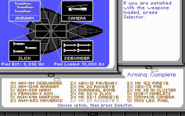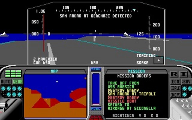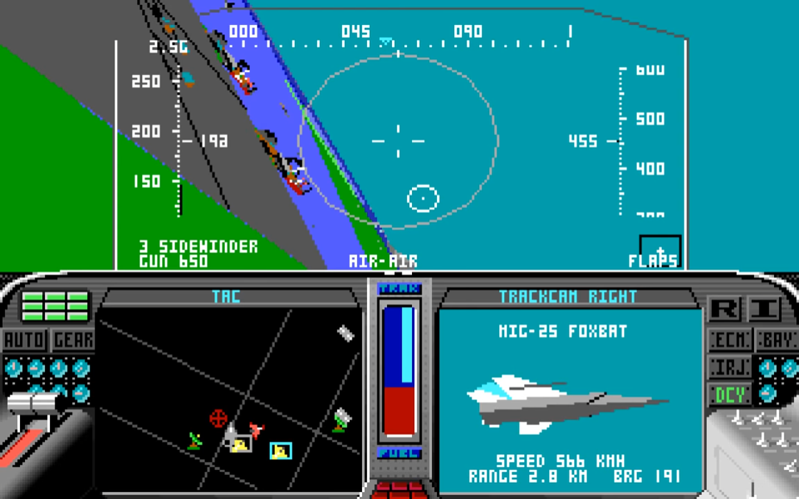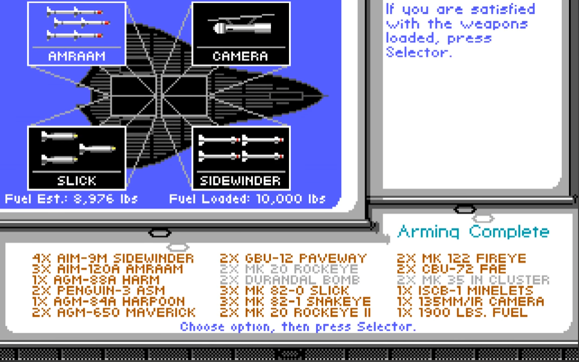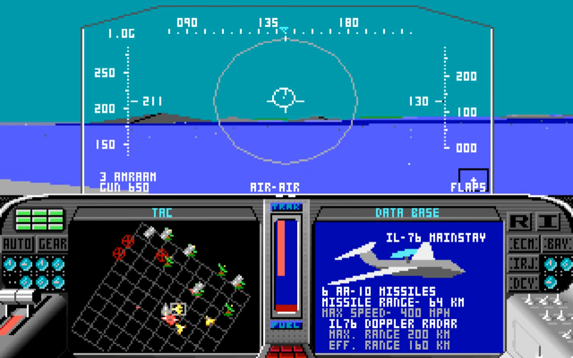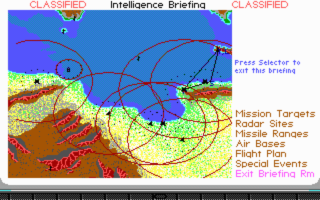| 435.04 | 16th May 1989 | Final release. Comes with AdLib support. Fixes: autopilot problem associated with wide-angle views now corrected, lockups on certain clones [particularly Lazers] fixed, pilot promotion sequence has been corrected and now agrees with the manual, mobile SAMs are now treated as SAMs (as documented) and not as bunkers, the divide overflow problem on certain clones/joystick cards has been fixed, and the Carlsbad bridge under the mountain has been fixed. |
