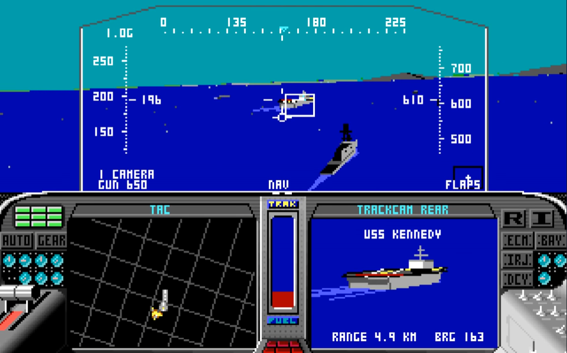 Furthermore, the two CRTs in the cockpit dynamically update to show the movement of both friendly and unfriendly forces around you, and when an aircraft or ground target is in your radar range, an image is shown of that exact target together with some specs about it, its range and speed, and whether you are within missile range. If you have air-to-air missiles selected, this display will show aircraft. If you have air-to-ground missiles or bombs selected, it will show only ground targets. Both these CRTs can be switched to show different things, from a tactical display (map) with zoom features, to the 'TrackCam' which shows the identity of nearby objects (aircraft or ground elements), your damage status, the waypoints that have been set, and onboard ordnance.