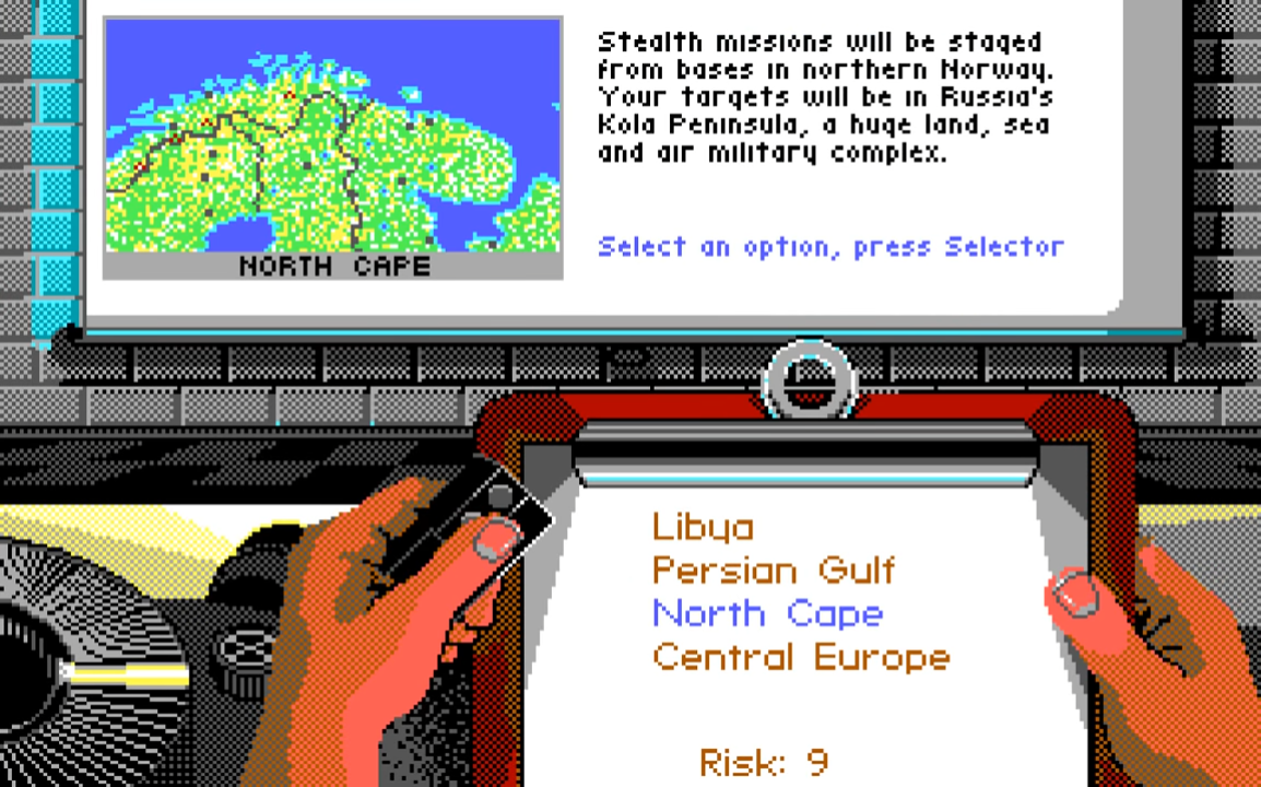 In F-19 Stealth Fighter, you take on the role of a rookie pilot who takes on missions in four theatres of war: The Persian Gulf, Central Europe, the North Cape, and Libya. In each mission, you are given a primary target and a secondary target to hit, and as you succeed you will gradually be promoted and offered new missions.