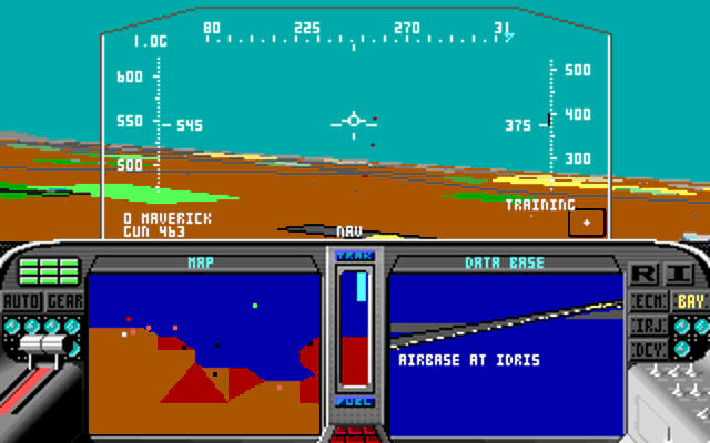 The in-flight graphics are, I feel, really good for 1988. F-19 Stealth Fighter runs at a maximum screen resolution of 320 x 200 in just 16 colours, but MicroProse Labs did an incredible job of creating a lovely world to fly around in given these limitations! What's more important, and probably a defining factor in the decision to limit the display resolution and colour depth, is the speed the game runs at - the minimum system specifications allow the game to run at a decent pace even on a 286. To help with this, you can choose from four different graphical detail levels using ALT-D while in-flight if you want to trade off graphical fidelity for frame rate.