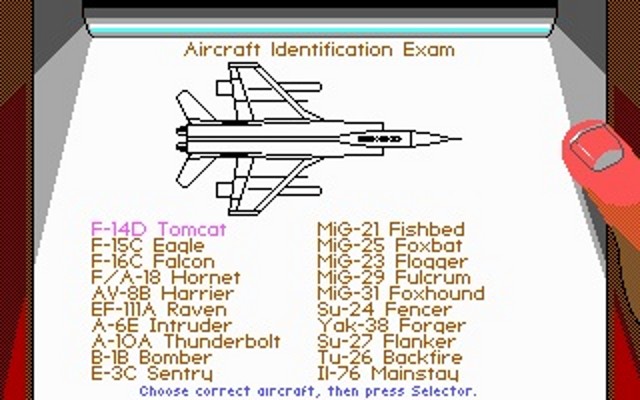 Once into the game, you are asked to identify a combat aircraft - these are in the back of the manual. If you get the answer wrong, you are automatically assigned to a training mission which allows basic take-off and landing only. Cracked versions automatically say 'Correct' regardless of your choice of aircraft. If you get the answer right, you are presented with the pilot selection screen: