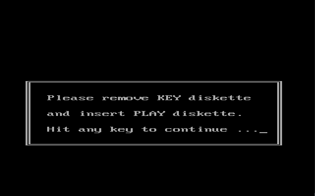 Note: With at least one cracked version of this game, hitting ESC when prompted for the key disk four times in a row allows the game to continue loading.