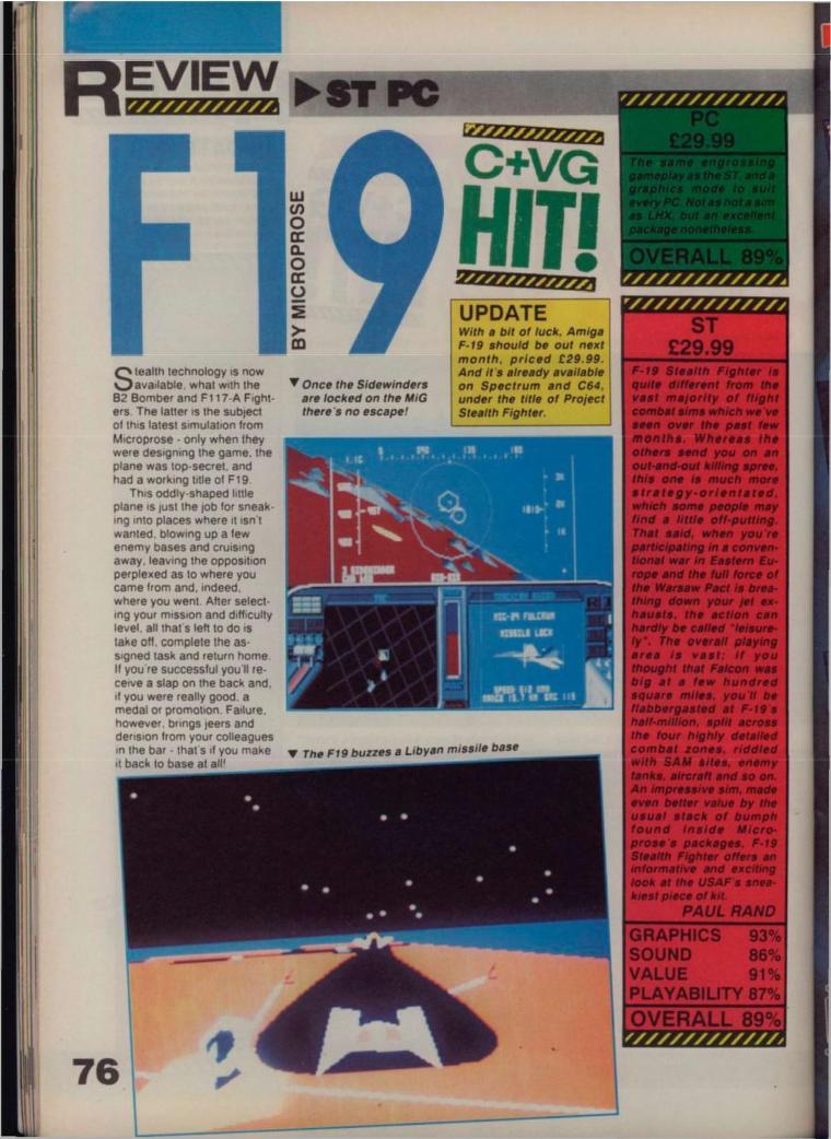 Some other quality flight sims that came out around the same time as F-19 were Battlehawks 1942 (Lucasfilm Games) and LHX Attack Chopper (Electronic Arts), not to mention MicroProse's own F-15 Strike Eagle II.