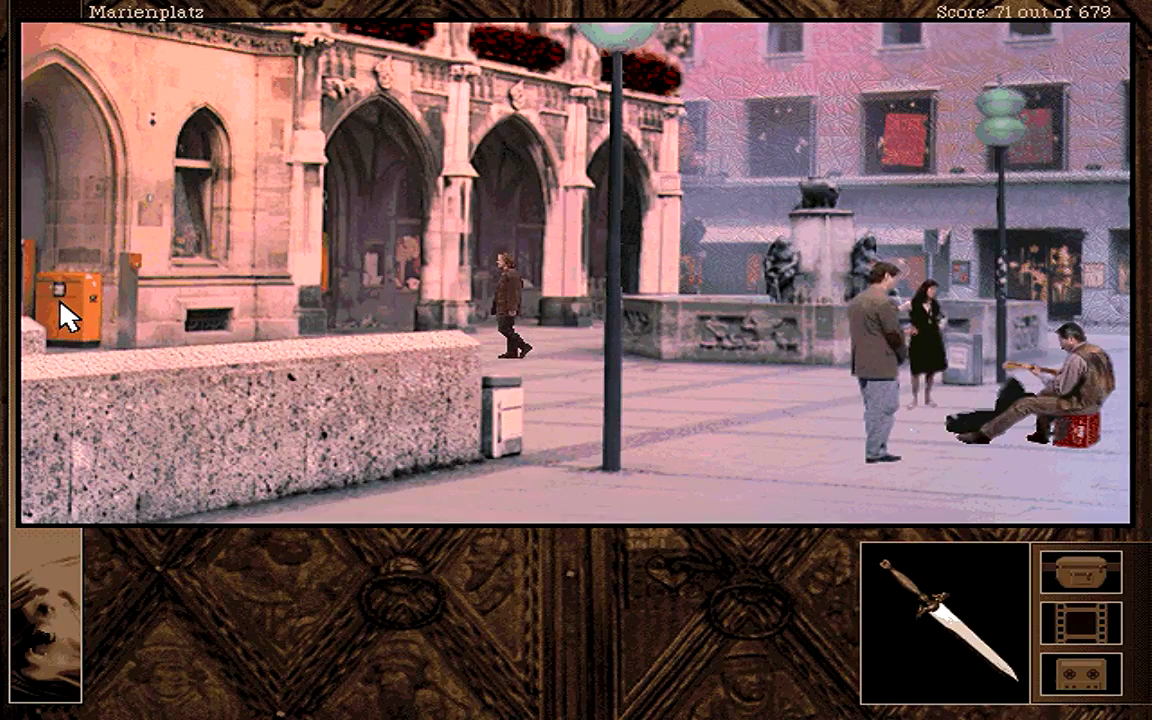 The second Gabriel Knight title takes advantage of a technology that was new at its time, although it was short-lived. The use of full motion video for making computer games was the equivalent of filming a Hollywood motion picture. Character dialogue and actions, such as entering a room or picking up an object, were filmed on camera. The game still features a game environment that the player interacts with. When clicking on some objects, the game will show video clips of actions related to them.