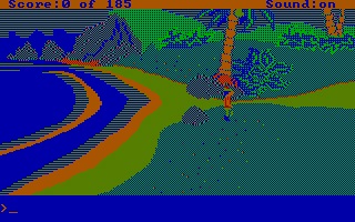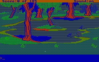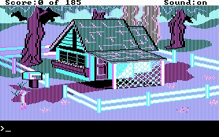 My version of this game has AGI interpreter version 2.917 (the most up-to-date interpreter released for this game), and by default it runs in EGA graphics mode. Running with the -c option worked well. -h wasn't tested as it requires a TTL (digital signal) monitor. -v I hoped would work but displayed corrupted EGA graphics.