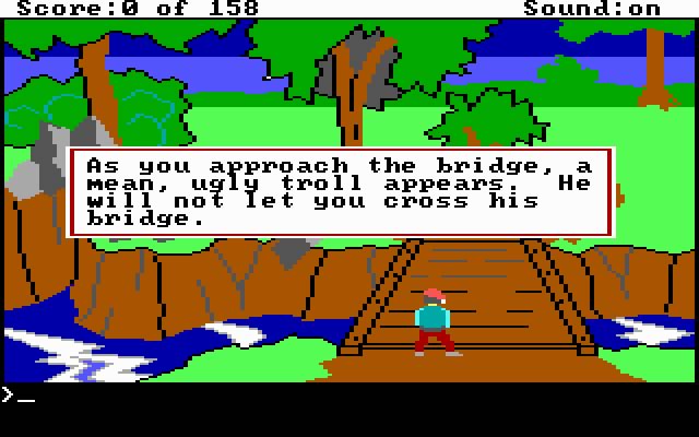 The game does not come with a setup program like later Sierra titles. All versions check the BIOS for an ID string that matches an IBM PCjr or Tandy 1000 and will initialise those systems' 3-voice PCG sound data and also load those graphics drivers. However, there are some command-line options to force the graphics mode. Simply run SIERRA.COM with: