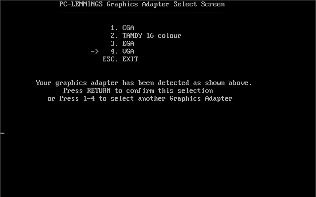 When the game is started from the LEMMINGS.BAT batch file, it runs the AUTODET.EXE utility which detects your graphics adapter and prompts you to choose. This cannot be run in isolation as the detection does not store any information in a configuration file (it sends a DOS errorlevel upon exit which is picked up by the batch file):