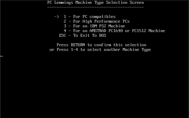 VGALEMMI runs the game in EGA, MCGA or VGA graphics mode. Use /e or /v command-line argument to force either EGA or MCGA/VGA mode. If you don't specify one of these, you will be asked to choose from a menu.