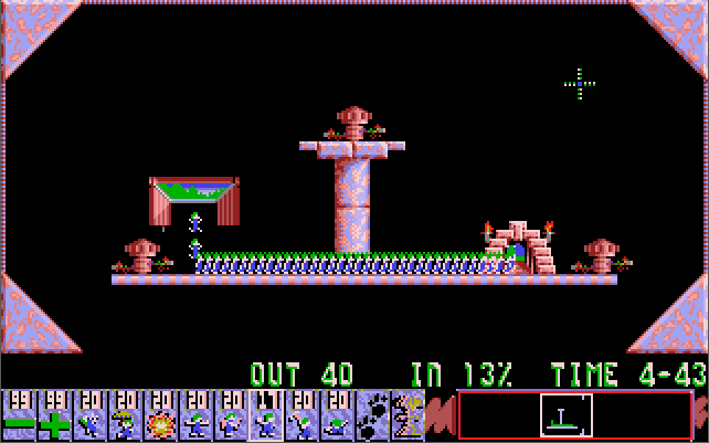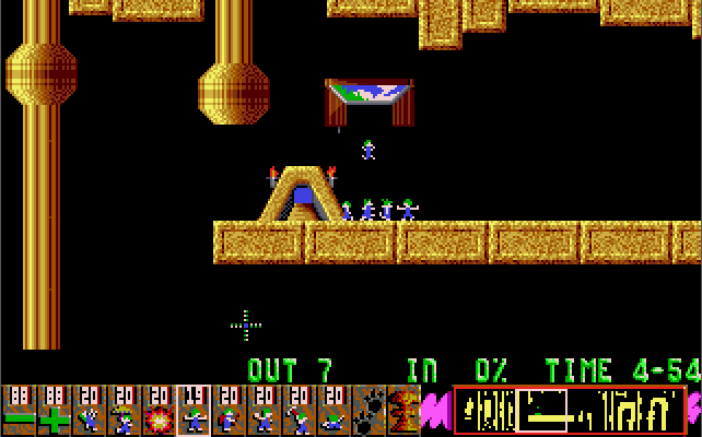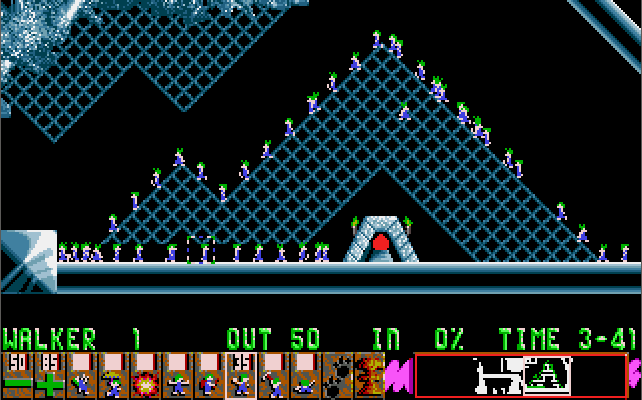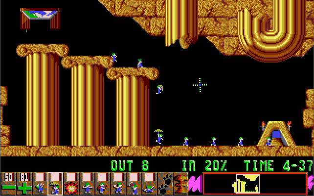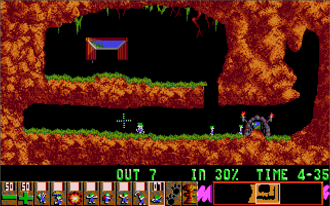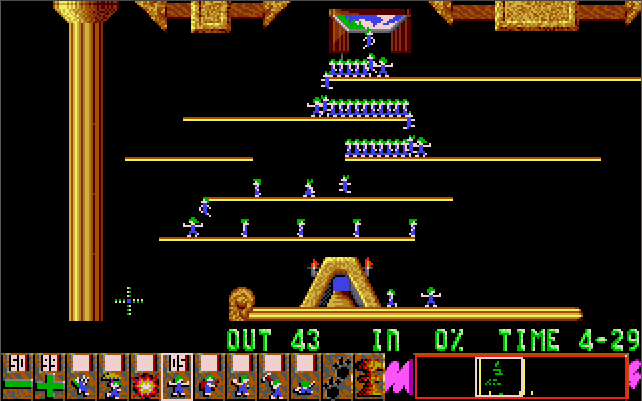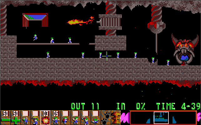 Lemmings is a puzzle game released by Psygnosis in 1991. The game has you tasked with getting a number of lemmings from the hatch where they materialise at the start of the level to the exit. Each level's design will comprise traps or deadly falls that will kill the lemmings without your intervention. The lemmings walk at all times, so you must act quickly and at the right time to navigate them to the exit.