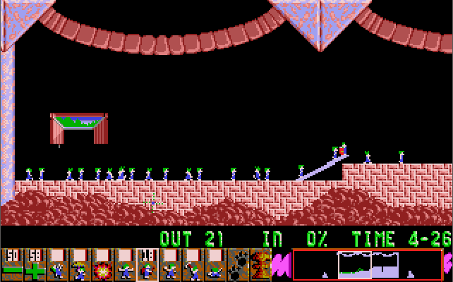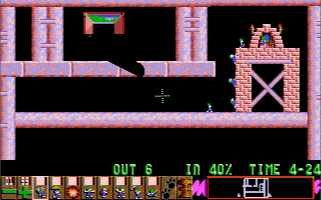 The game's navigation is simple - move the mouse cursor to an action at the bottom of the screen and click on a lemming to make them perform that action.