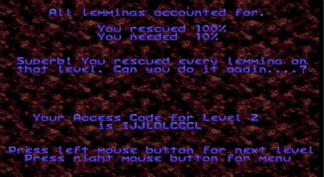At the end of every level you are given a password. This can be entered from the main menu to jump to that level. There is no other save game facility in Lemmings, though these 'level codes' don't change as they are hard-coded (see Supporting Documents for a file containing the list of level codes).