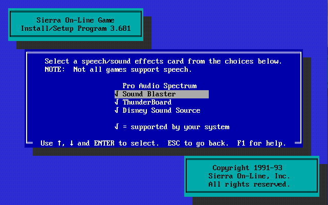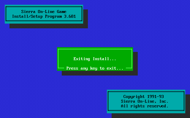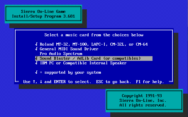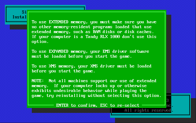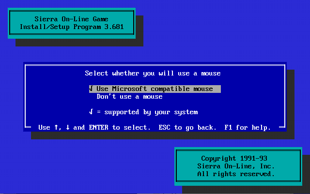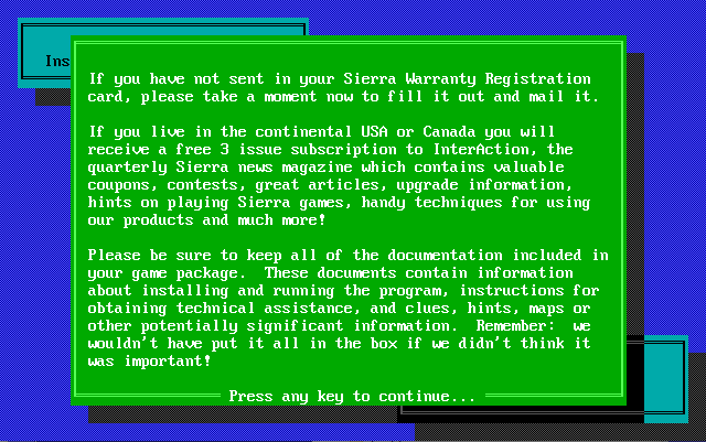 | System Requirements | 8088/8086 CPU (80286 required for 256-colour version), 640 KB RAM, DOS 3.3. Graphics support for EGA/Tandy (sold separately) or MCGA/VGA Audio support for PC Speaker, Game Blaster, PS/1 Audio Card, Tandy/PCjr, Ad Lib, Sound Blaster, or Roland MT-32/LAPC-I. Mouse optional (but recommended). |