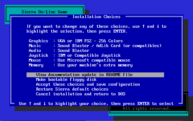 To configure the game for your hardware, run the provided INSTALL.EXE utility. You have the following options: