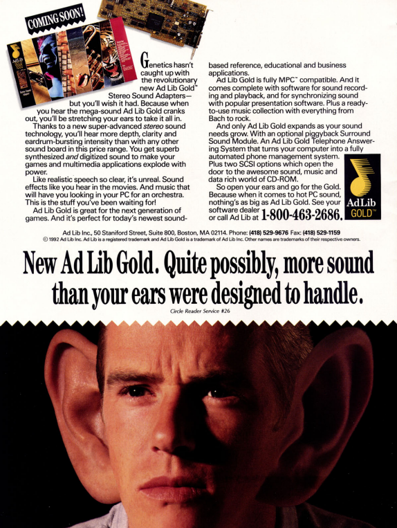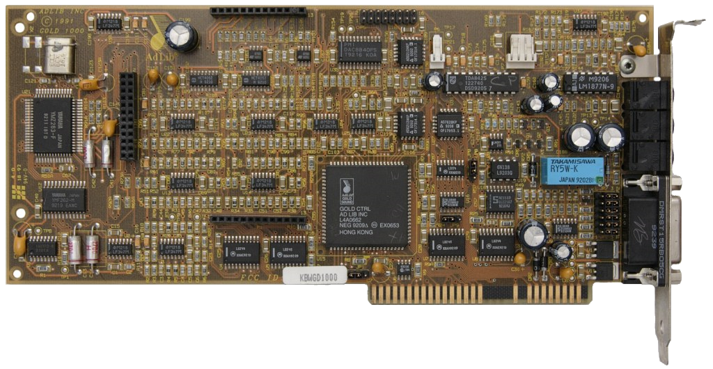 Ad Lib returned to a crowded market in 1991, one that dominated by Creative Labs. Their new offering, the Ad Lib Gold was actually more functional than Creative's Sound Blaster Pro which was launched at the same time, and instead used a pair of Yamaha YM-3812 chips to provide stereo audio. Sadly, Ad Lib struggled to get games developers to support the Gold.