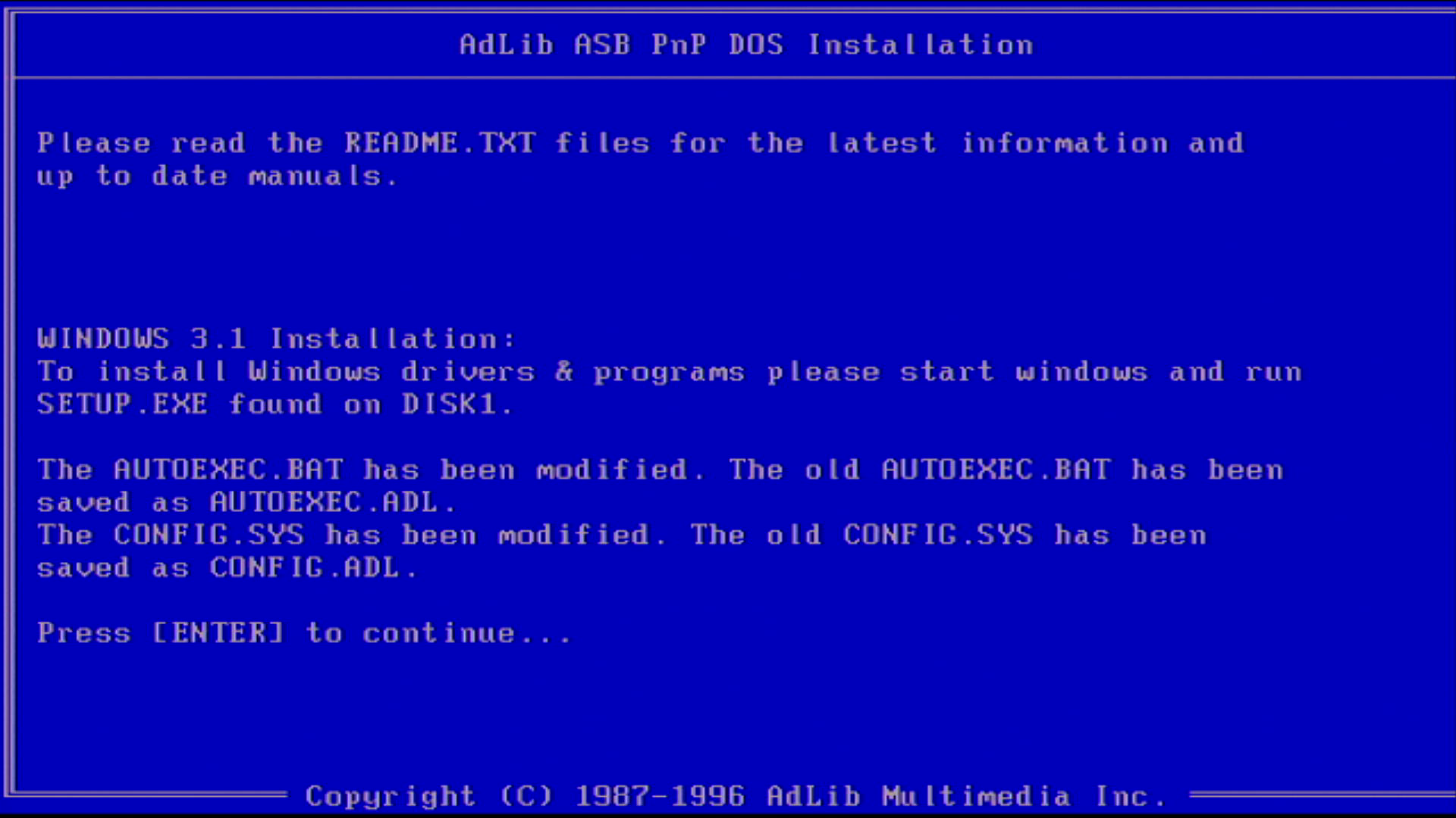 AdLib Sound Driver - The Ad Lib Sound Driver is a special sound engine written by Ad Lib to feed sound to their AdLib sound cards. The DOS program was run before the start of a game and ran hidden in the background. When a game developer wanted to play music or sound effects, they would issue a call to the program with the specified ROL music file and its necessary INS or BNK instruments. Songs could be started and stopped, and there were probably other features like fade-in and fade-out. Dozens of games, especially those that use ROL format music, utilized AdLib's sound driver.