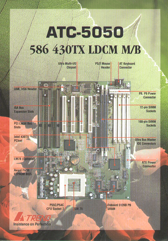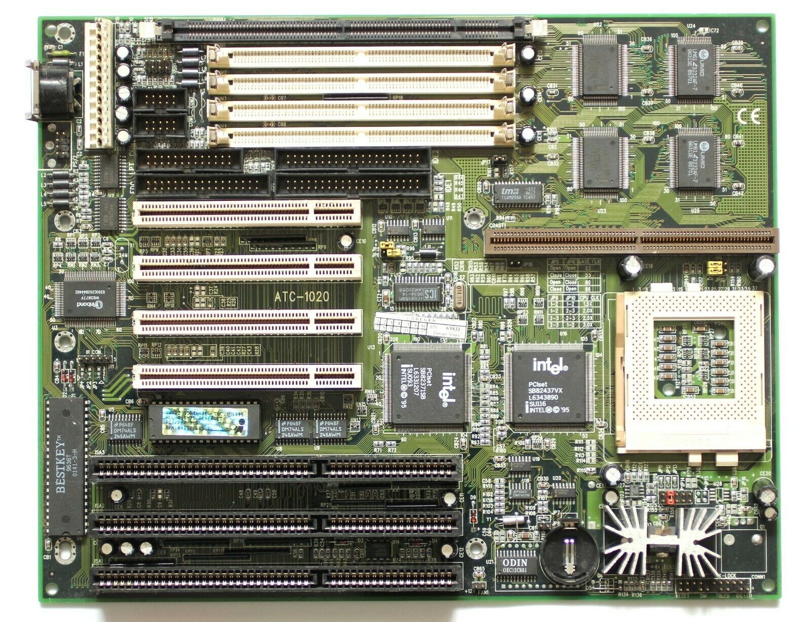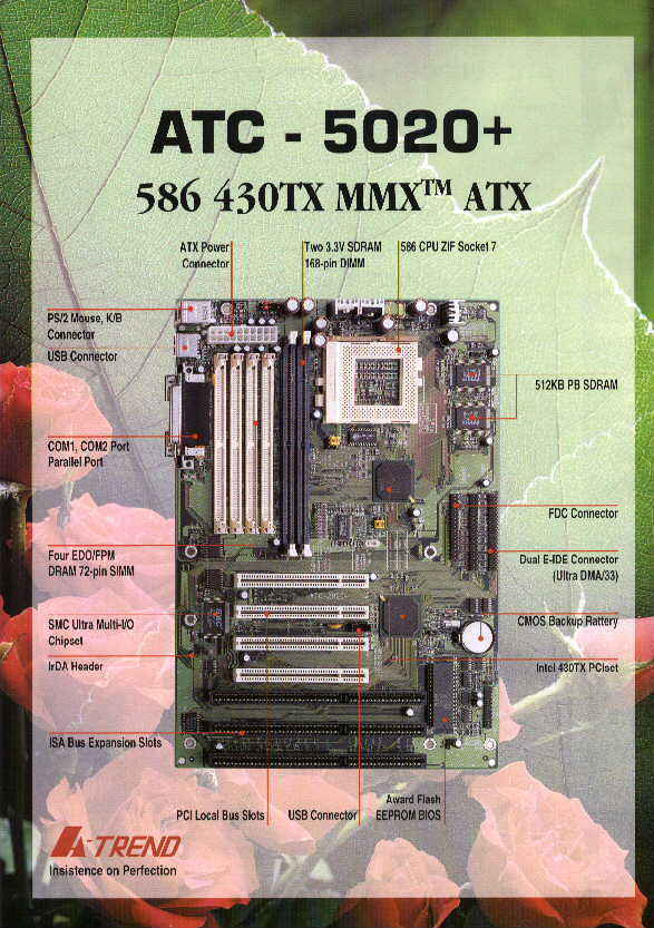 This board is similar to the ATC-1000+ but exchanges one ISA slot for an extra PCI slot, and comes with a COAST slot for extra L2 cache. It supports Pentium P54C from 75 MHz up to 200 MHz, with core voltages from 2.7V up to 3.5V. It also allows Cyrix 6x86 or 6x86L CPUs: PR120+, PR133+, PR150+ or PR166+, and AMD K5 or K6 PR166 or PR200. The Front Side Bus will run at 50, 60 or 66 MHz.