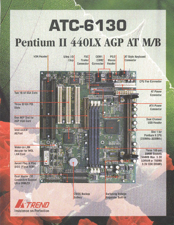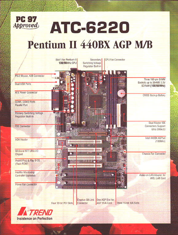 The ATC-6260 was a dual-Slot 1 motherboard, allowing for two Pentium II CPUs. It also came with onboard 64-bit Ultra-Wide and Ultra SCSI. Like the ATC-6220 the 6260 also supported Creative's SB-Link PC/PCI interface for legacy DOS sound cards.