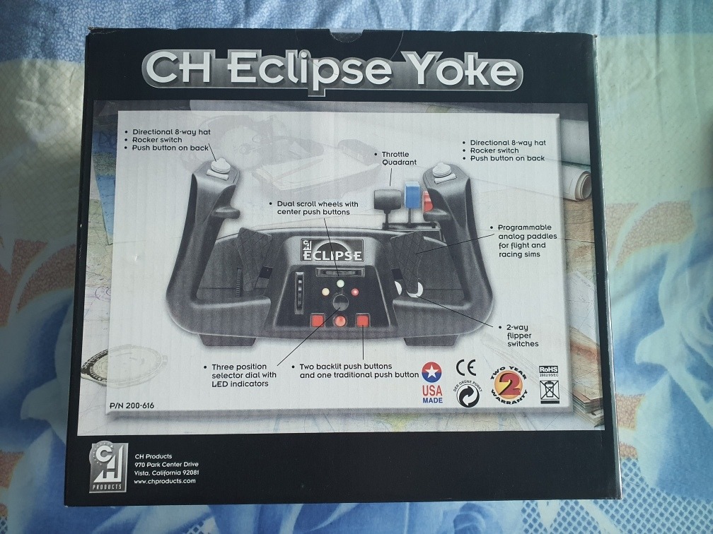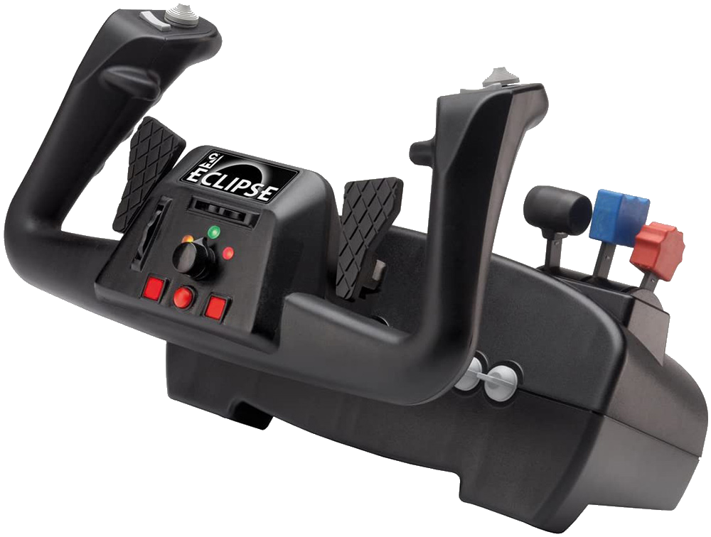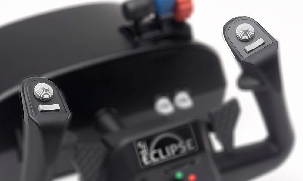The Eclipse Yoke is the high-end flight yoke with built-in rudder and throttle functions. Programmable fingertip paddles allow for both rudder functions in flight sims or shift for racing games. Color coded handles for throttle, prop and mixture, trim / scroll wheels and a three color selector dial gives you functions galore!