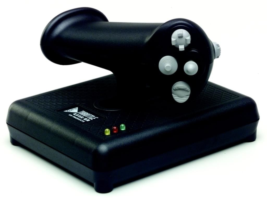 An ergonomic left-handed jet-styled slide throttle with 3 axis, 4 buttons, three 4-way hat switches and one 8-way hat switch for a total of 112 programmable functions (with Control Manager software) and two axis dedicated to the mini joystick for precision pointing or movement. Three separate programming modes accessed on the fly via mode button on handle and color LED's to indicate which mode is selected (Windows only).