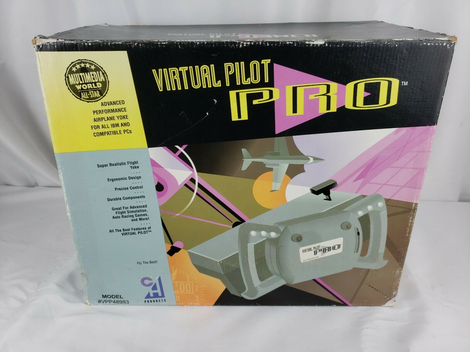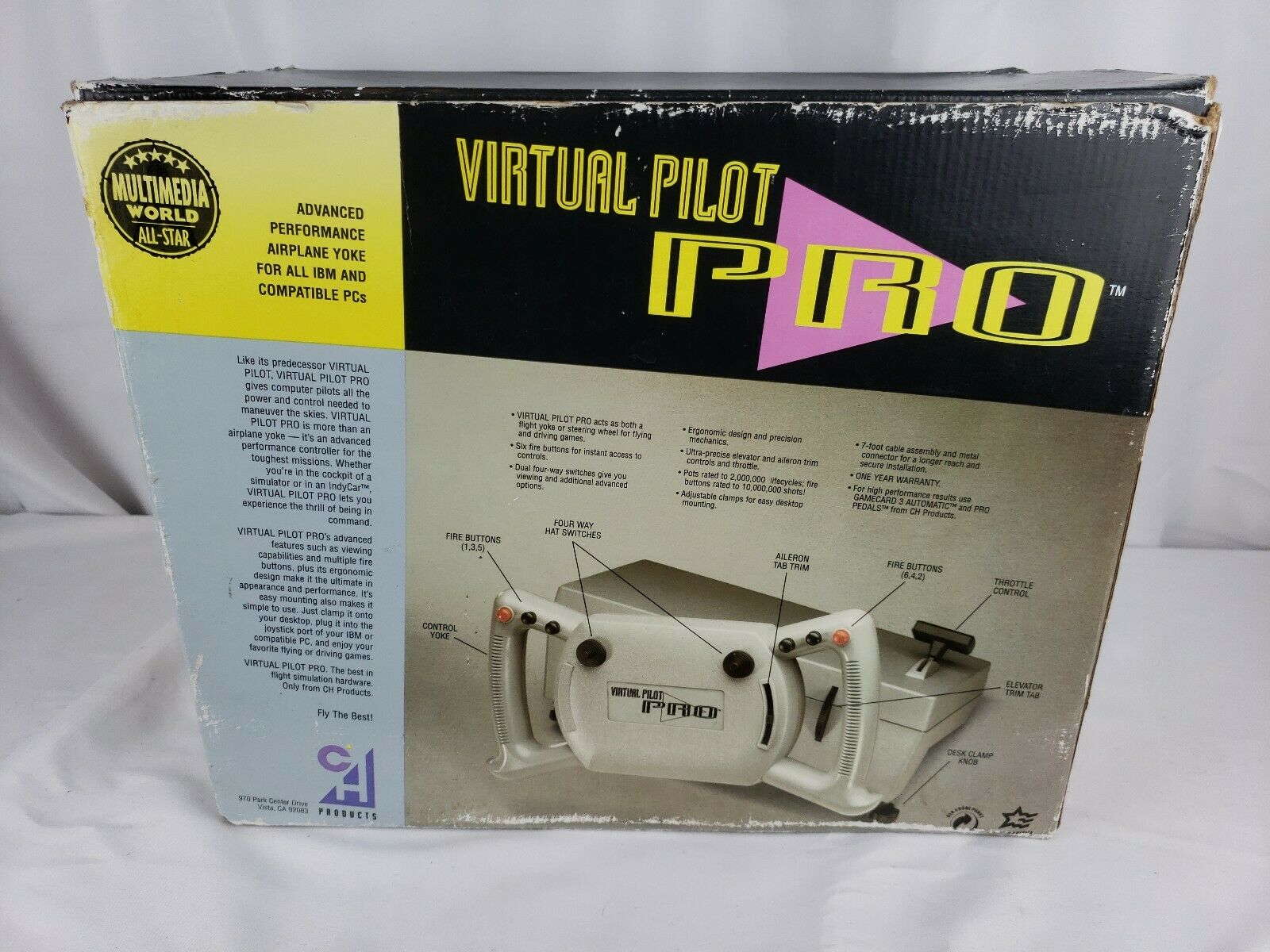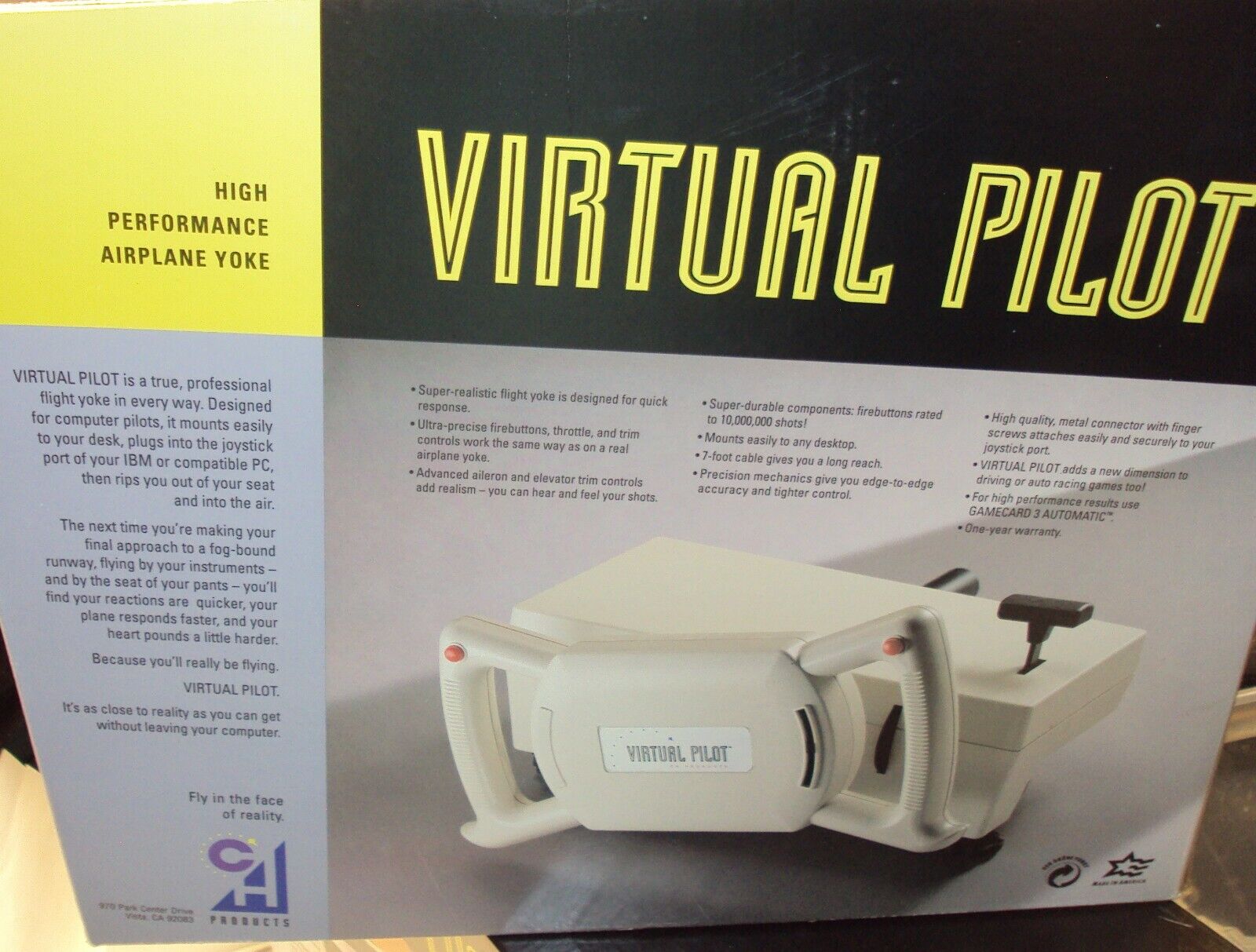 " You may remember a product that came out of CH Products a couple years back called the Virtual Pilot. It was a flight yoke with two fire buttons, trim controls, and a throttle. It was state of the art when it appeared, and it sold in droves to those folks whose be all and end all was computer-aided flying. Meet its technological offspring, the Virtual Pilot Pro. The throttle and trim controls still adorn the yoke, but CH Products has added four more fire buttons, as well as two four-way hat switches. The unit clamps to your desk by way of two screw-down plastic feet (note that the maximum spread for clamping is 1-3/4 inches and max depth is 1 inch) that, despite looking as though they'd have no holding power or would slip and slide, do an admirable job of holding the Virtual Pilot Pro firmly in place. Just don't yank incredibly hard on the yoke, and the unit should stay put.