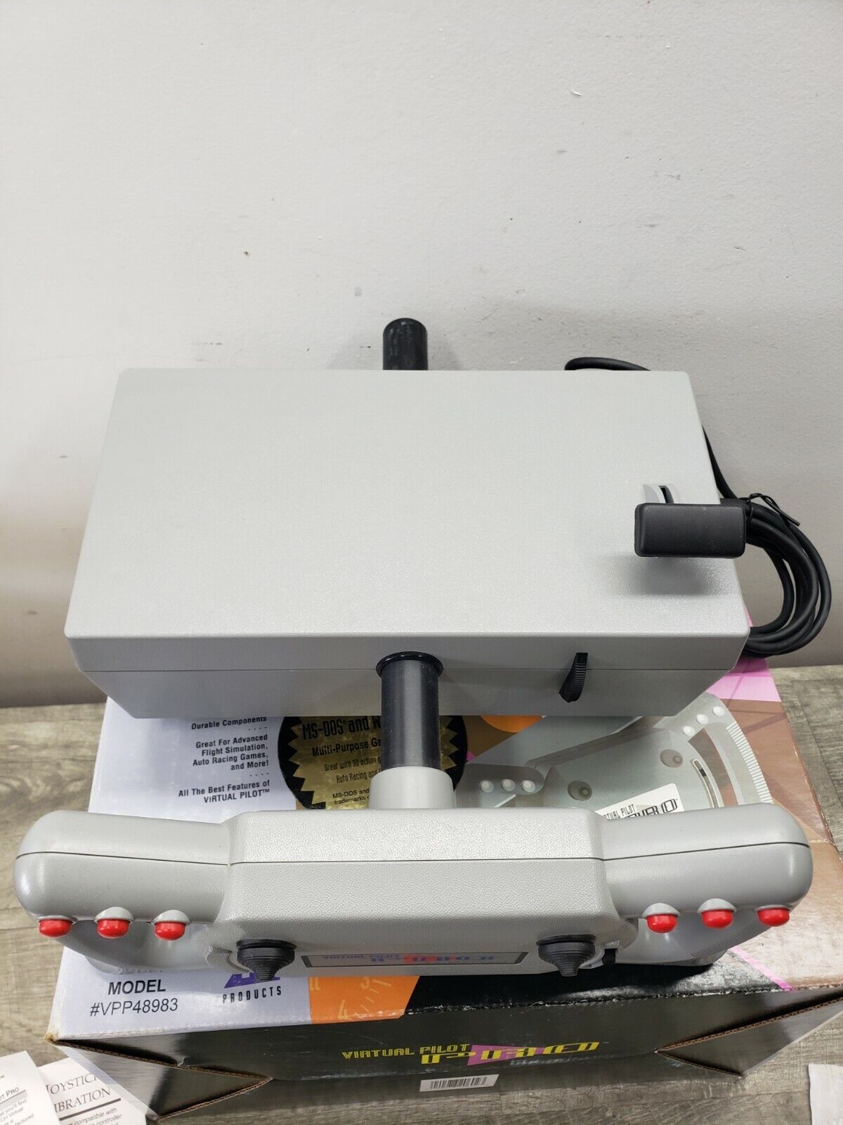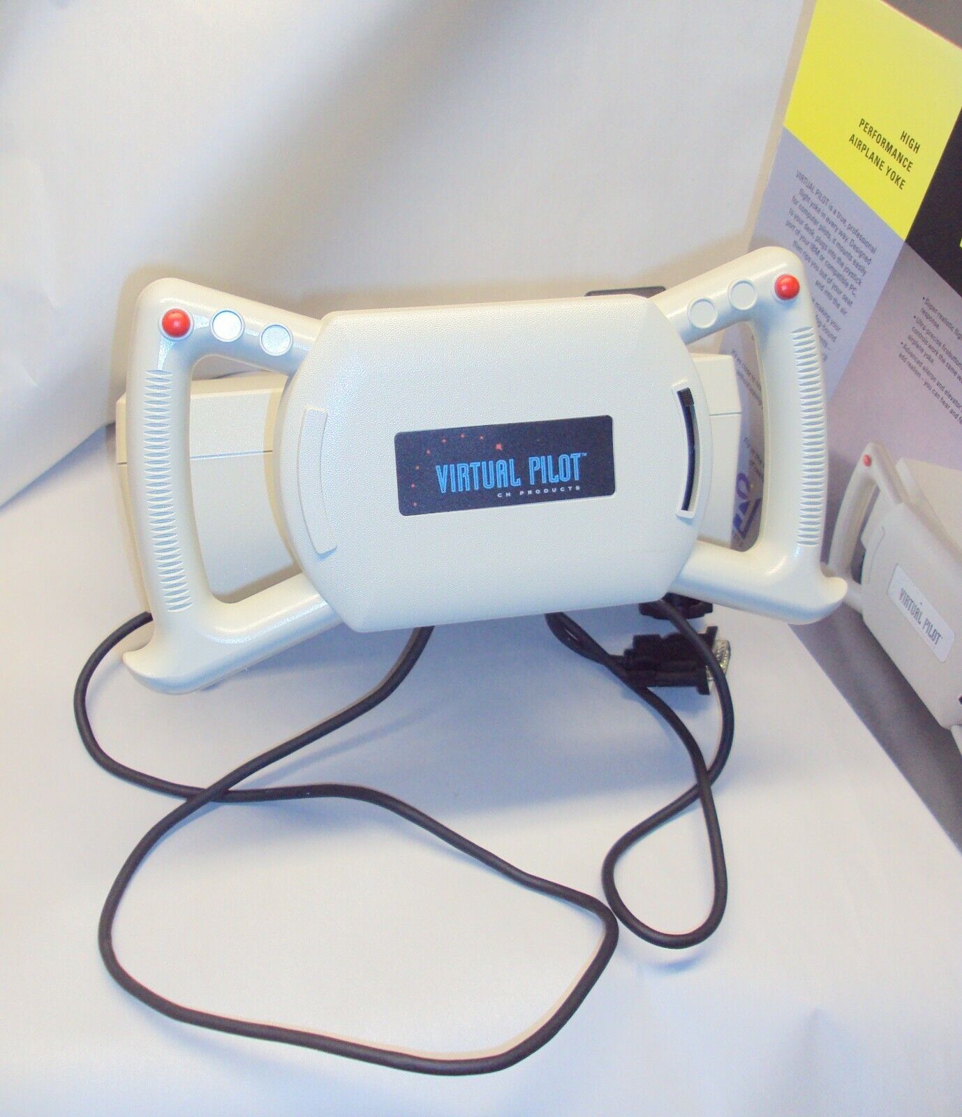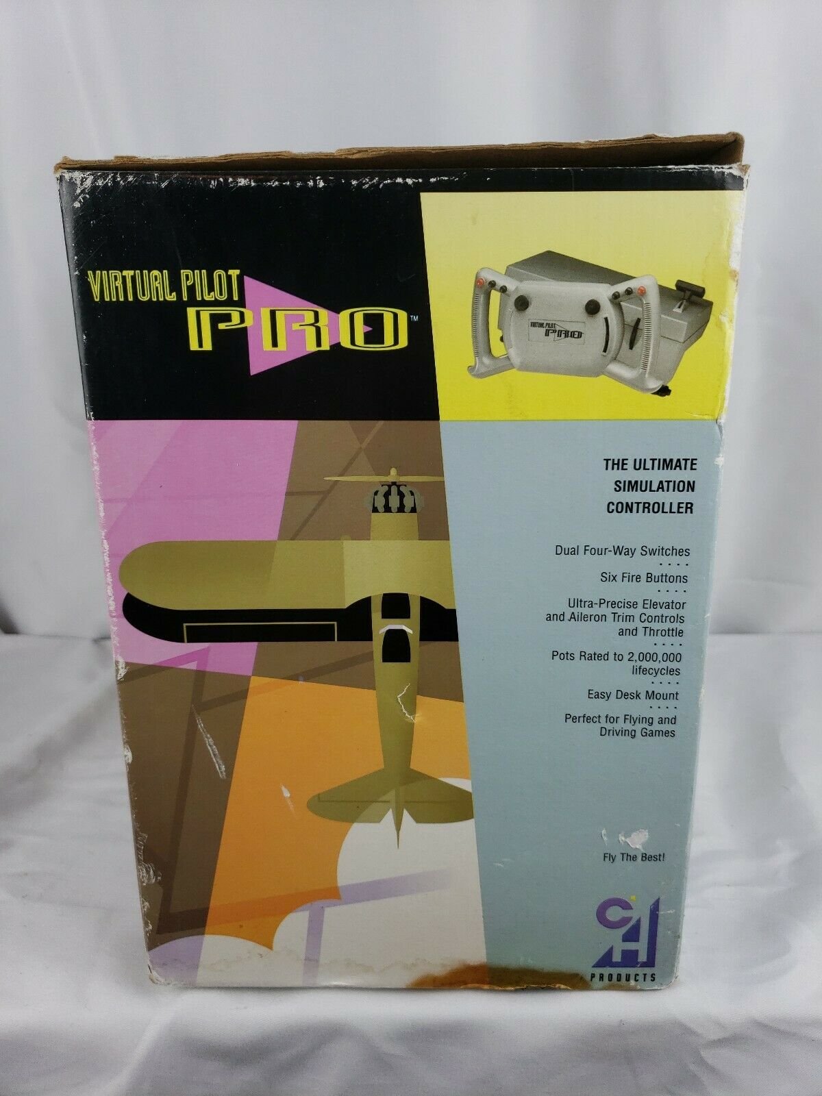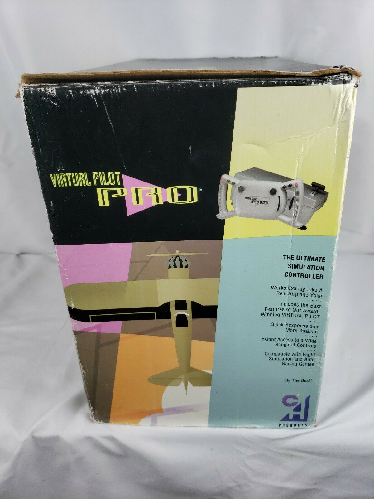" You may remember a product that came out of CH Products a couple years back called the Virtual Pilot. It was a flight yoke with two fire buttons, trim controls, and a throttle. It was state of the art when it appeared, and it sold in droves to those folks whose be all and end all was computer-aided flying. Meet its technological offspring, the Virtual Pilot Pro. The throttle and trim controls still adorn the yoke, but CH Products has added four more fire buttons, as well as two four-way hat switches. The unit clamps to your desk by way of two screw-down plastic feet (note that the maximum spread for clamping is 1-3/4 inches and max depth is 1 inch) that, despite looking as though they'd have no holding power or would slip and slide, do an admirable job of holding the Virtual Pilot Pro firmly in place. Just don't yank incredibly hard on the yoke, and the unit should stay put.