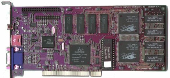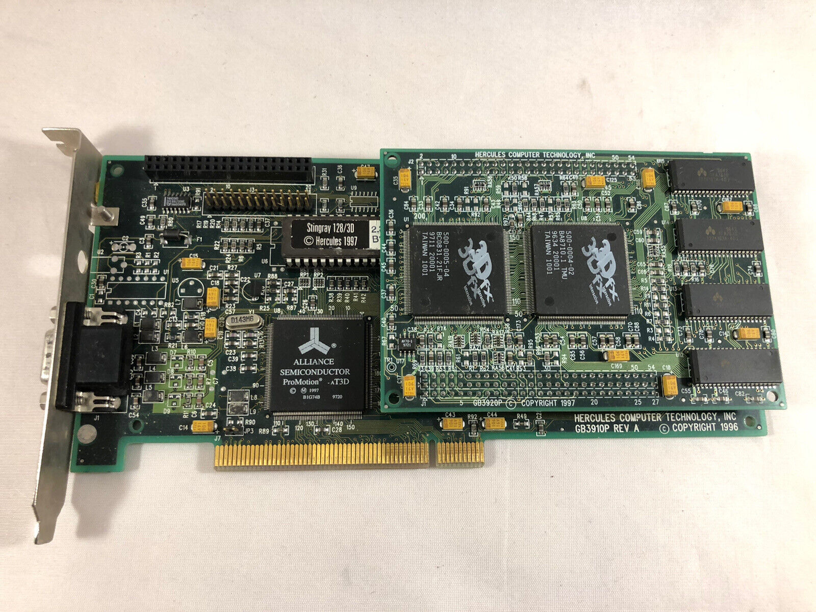 The Hercules Stingray 128 3D was their 3dfx Voodoo Rush card which provided both 2D graphics acceleration via its Alliance Semiconductor ProMotion AT25 chip, and 3D acceleration via the 3dfx chips.