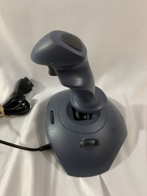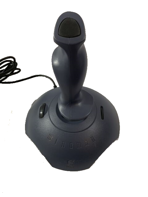 The original WingMan Attack joystick arrived in the late 1990s. It was a 2-axis analog joystick with an analog throttle and four digital buttons: a trigger, a primary thumb button on the top of the joystick, and two secondaries. The joystick is black and the base is gray. It connects to a computer with a DA-15 plug.