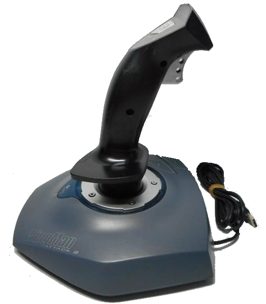 The WingMan Attack 2 was released in the early 2000s. It is a 2-axis joystick with two base buttons and a slightly modified graphic on the top compared to the original WingMan Attack. The joystick is black, the base is gray, and the throttle is silver to make it look like metal. It connects to the PC via a USB 1.0 interface.