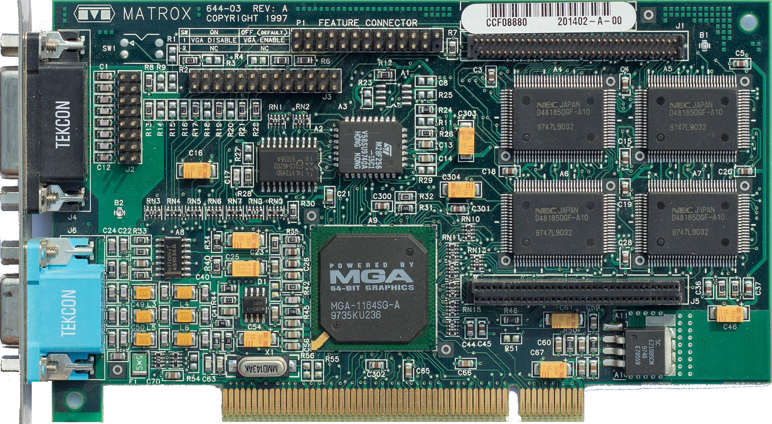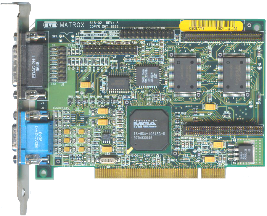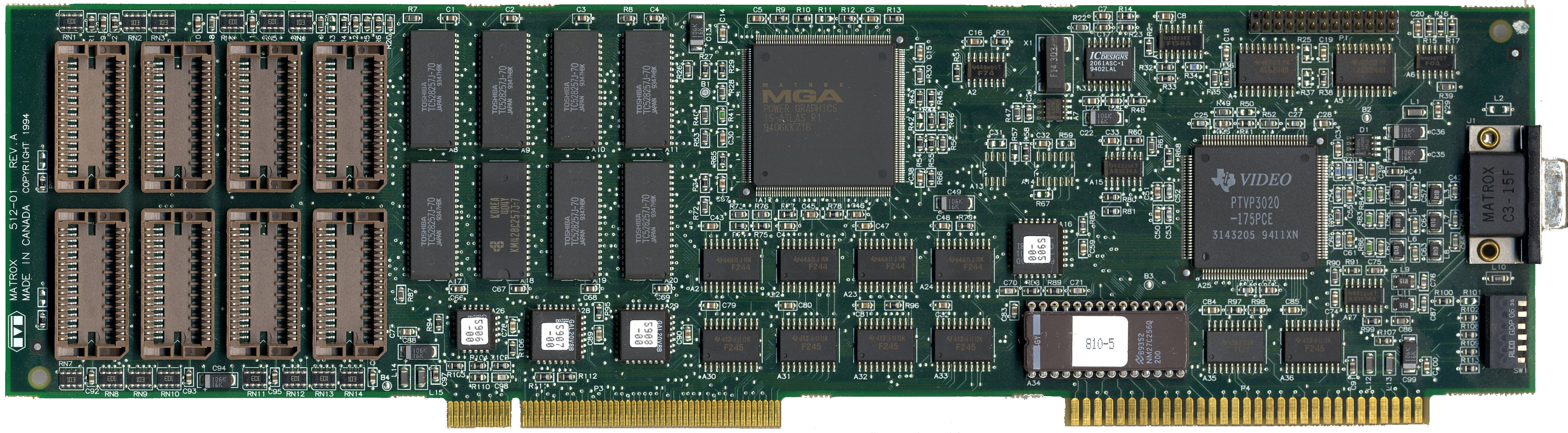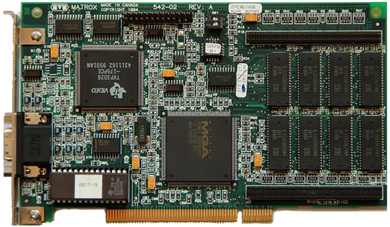 They were probably most famous for their MGA (Matrox Graphics Architecture) engine, launched in May 1993, which was a 64-bit engine that produced superior 2D graphics (important during the era of CRTs) and also had a reputation for being high performers. Similar to ATI's Mach32 and S3's 86Cxxx family of chipsets, MGA accelerated common graphics functions such as BitBlts (bit block transfers) and pattern, polygon, and rectangle fills. It went one better though, and also provided acceleration for 3D Gouraud shading, z-buffering, and character drawing. It was optimised for 486- and Pentium-class computers and was designed with PCI in mind, with its 128-bit bus: 64-bit for graphics (twice as wide as most existing graphics accelerators at the time) and 64-bit for video output. There was also an NTSC/PAL encoder daughterboard called VideoPro that could be installed on MGA cards to provide broadcast-quality TV video output to your desktop.