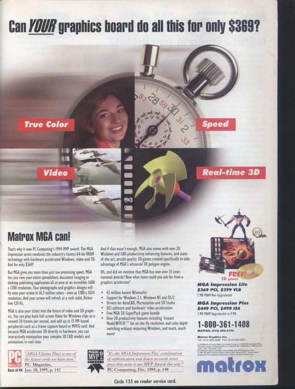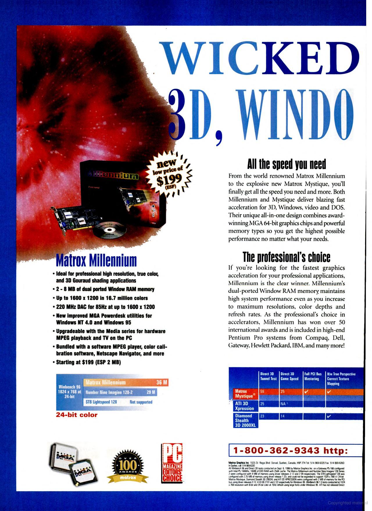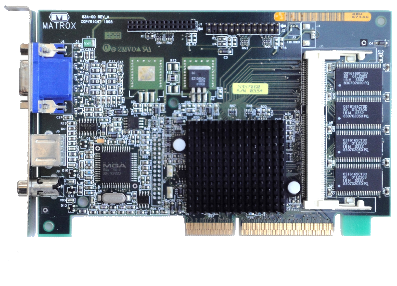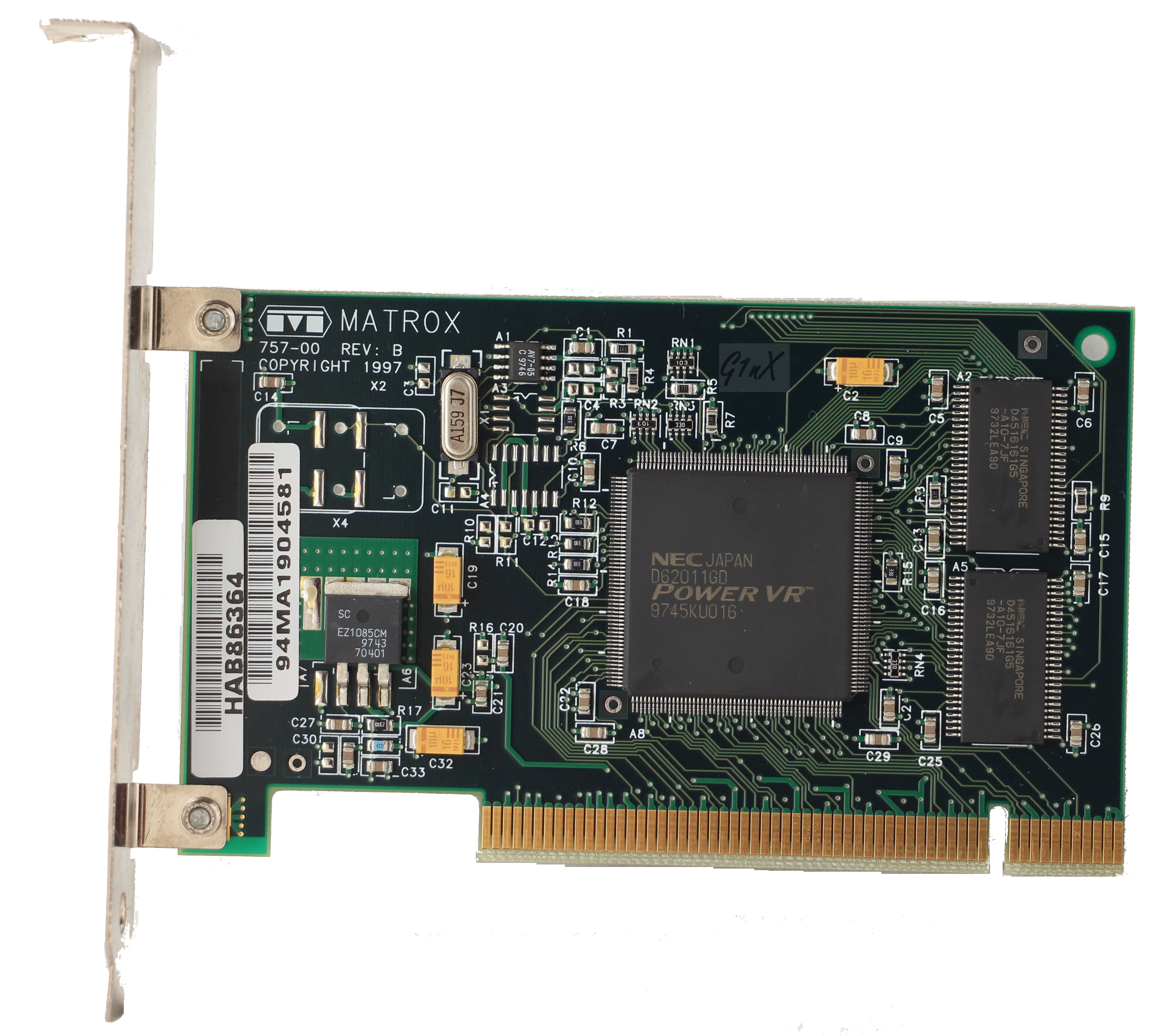 They were probably most famous for their MGA (Matrox Graphics Architecture) engine, launched in May 1993, which was a 64-bit engine that produced superior 2D graphics (important during the era of CRTs) and also had a reputation for being high performers. Similar to ATI's Mach32 and S3's 86Cxxx family of chipsets, MGA accelerated common graphics functions such as BitBlts (bit block transfers) and pattern, polygon, and rectangle fills. It went one better though, and also provided acceleration for 3D Gouraud shading, z-buffering, and character drawing. It was optimised for 486- and Pentium-class computers and was designed with PCI in mind, with its 128-bit bus: 64-bit for graphics (twice as wide as most existing graphics accelerators at the time) and 64-bit for video output. There was also an NTSC/PAL encoder daughterboard called VideoPro that could be installed on MGA cards to provide broadcast-quality TV video output to your desktop.