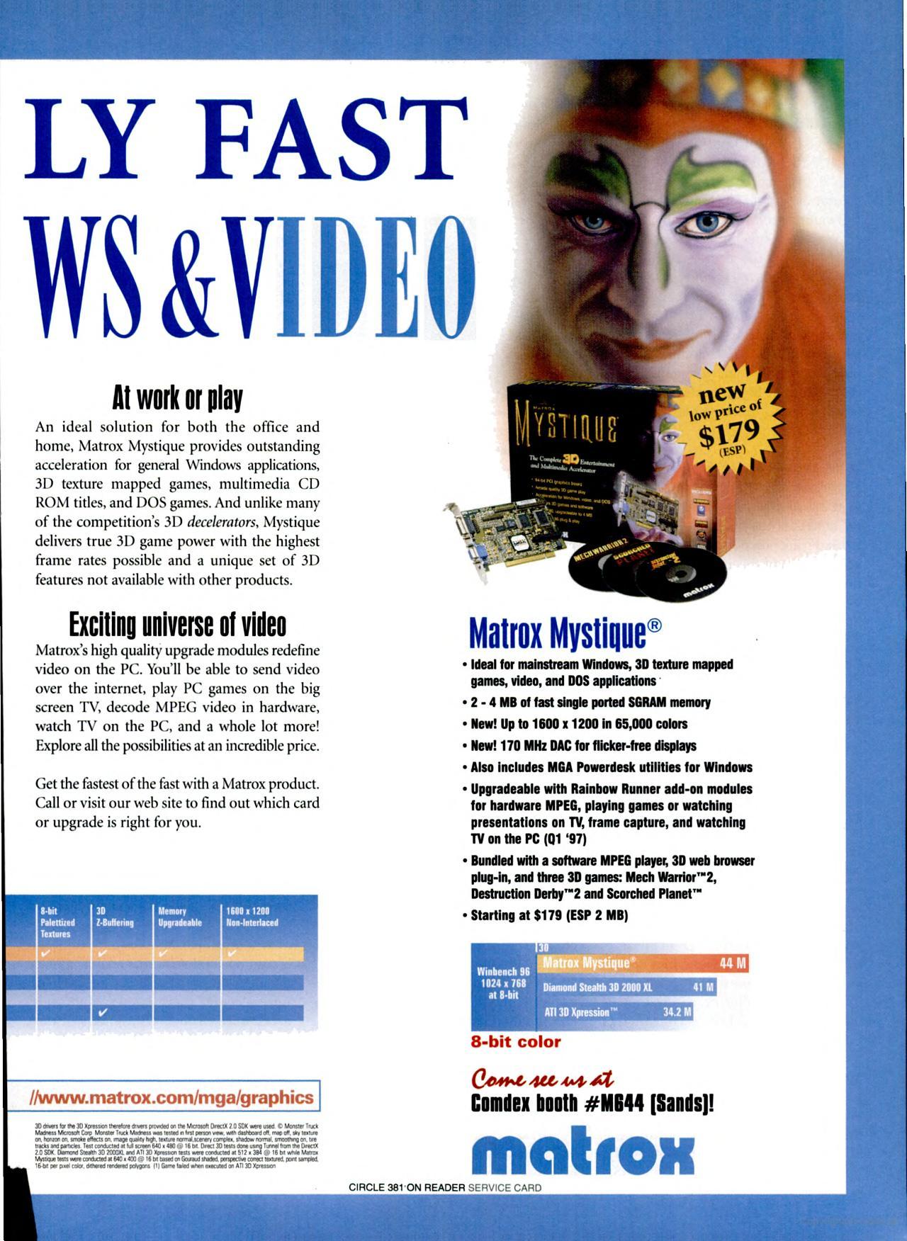 Summing Up: Not a great deal of difference from the earlier Mystique, just slightly faster so it's the same message here - great 2D quality and performance for a 1997 card. For 3D gaming, performance still just fractionally beat the latest S3 ViRGE/DX card [also from 1997] with 4 MB on both and ATI Mach 64 cards though 3D image quality was poorer due to its limited 3D feature set. If you have a 3dfx Voodoo 1 card, use that in conjunction with this for better 3D performance.
