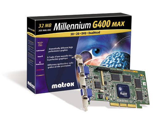 With 32 MB of Double Data Rate (DDR) memory, a 360 MHz primary RAMDAC, and a unique HeadCasting™ Engine accelerating 3D online communication, the Millennium G550 is a titan among graphics cards with trendsetting appeal for the business and home entertainment markets. Comprising an extensive feature set including third-generation DualHead® display capabilities, outstanding 2D performance, and DVI-I support, the Millennium G550 delivers exceptional graphics performance and product stability and ignites a new trend in online communication.