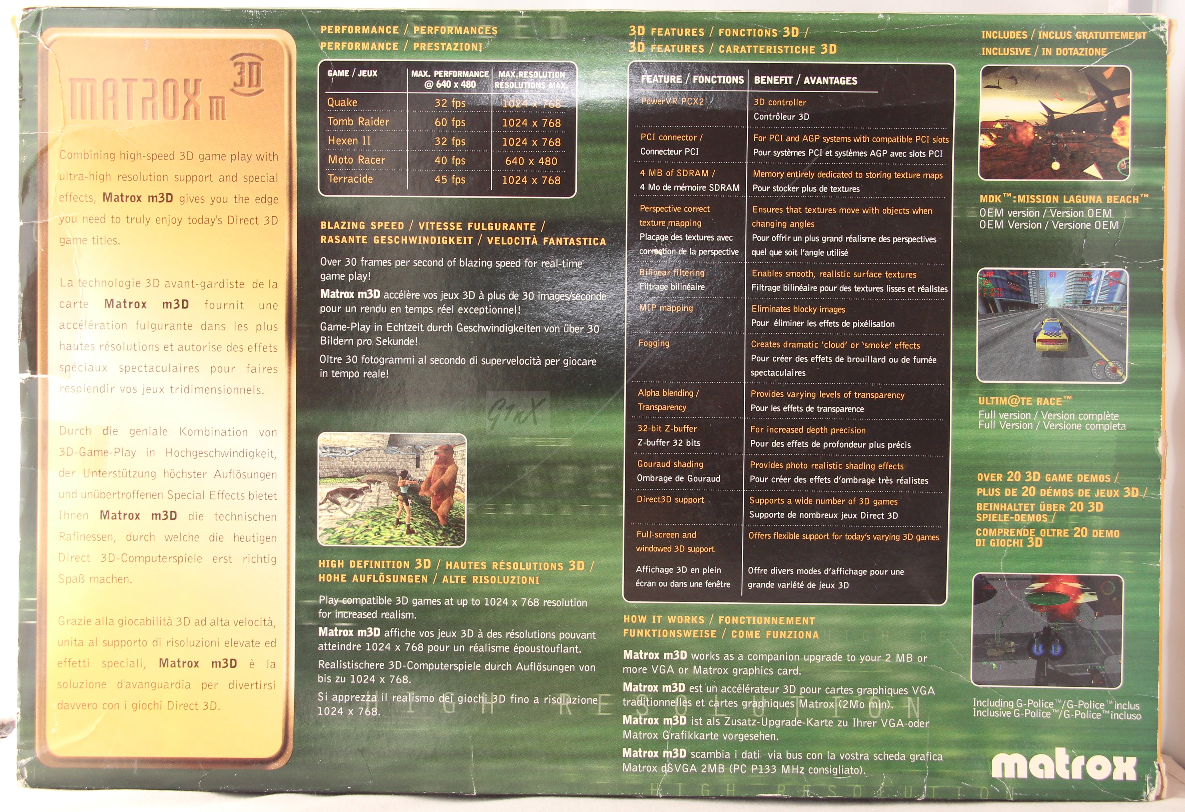 Matrox m3D takes you to the outer limits of 3D gaming. Combining high-speed 30 frames/second game play with support for up to 1024 x 768 resolution, Matrox m3D gives you the edge you need to truly enjoy today's Direct3D games. What's more, two 3D games are included: Ultim@te Race (full version) and Hexen IITM: Continent of Blackmarsh (9 level OEM version ). European customers will receive Ultim@te Race (full version) and MDKTM: Mission Laguna BeachTM (OEM version ). Also included are over 20 3D game demos, making it the most cost-effective, full-featured 3D upgrade for your PC.