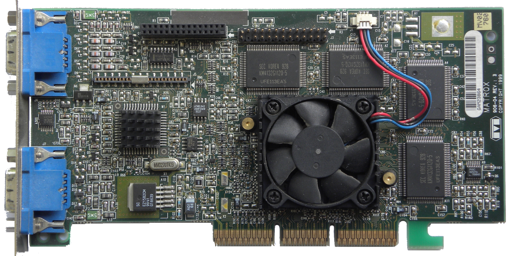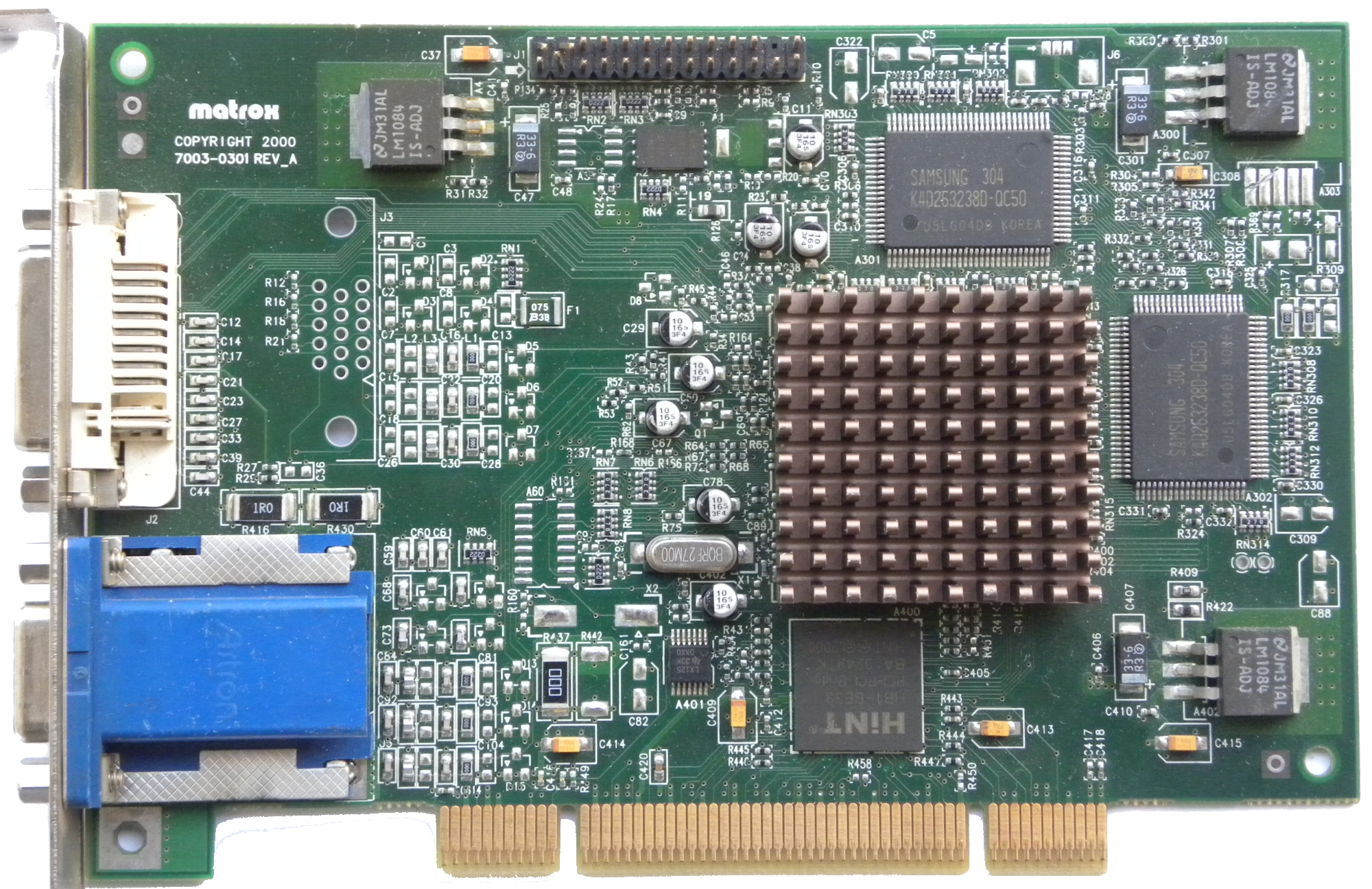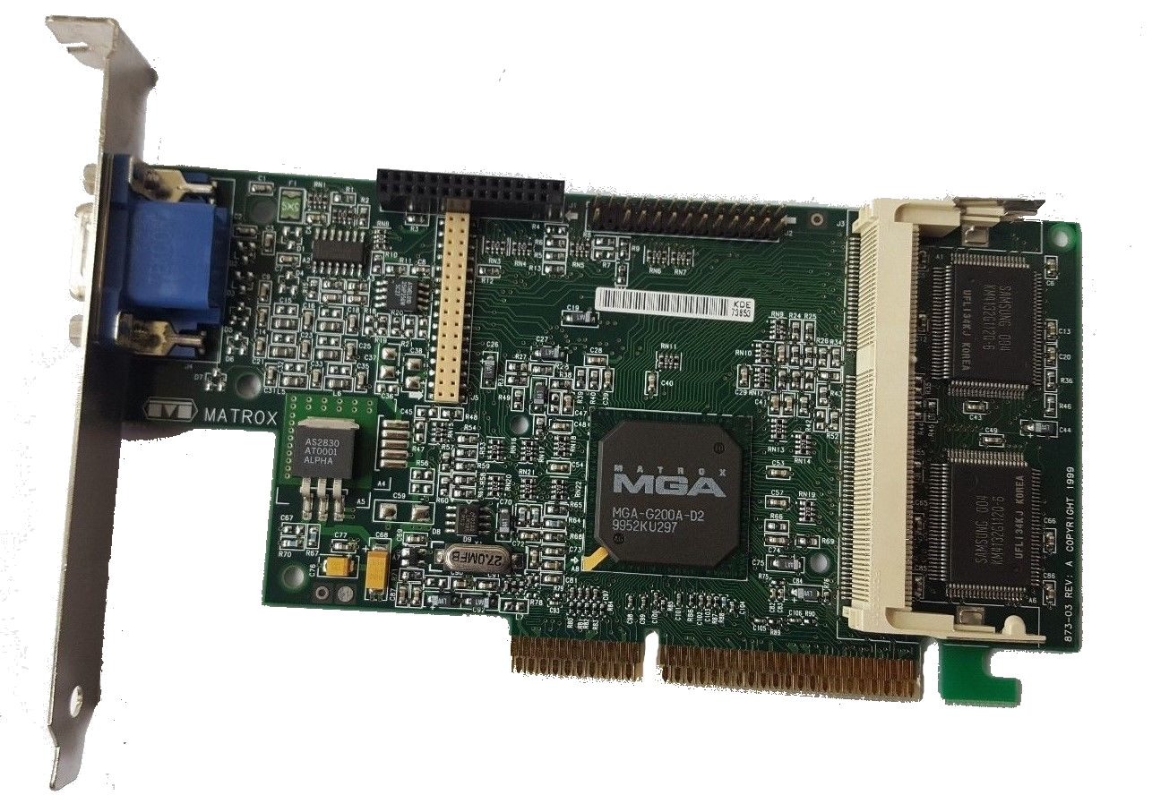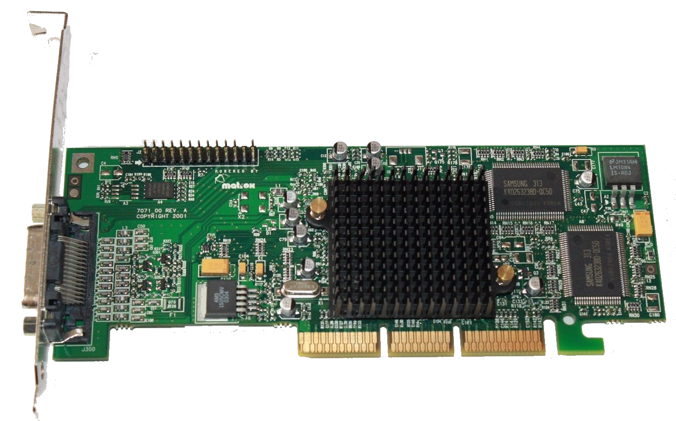 Millennium 2 / Millennium II (AGP 1x, 1997) Millennium G200 (AGP 1x, 1998) Mystique G200 (AGP 1x, 1998) Millennium G250 (AGP 1x, 1998) Millennium G400 (AGP 1x/2x/4x, 1999) Millennium G400 Max (AGP 1x/2x/4x, 1999) Millennium G450 (AGP 1x/2x/4x, 2000) Millennium G550 (AGP 4x/8x, 2001) Millennium P650 Dual Head (AGP 4x/8x, 2002) Millennium P650 Low Profile (AGP 4x/8x, 2002) Parhelia / Parhelia 512 (AGP 4x/8x, 2003) |