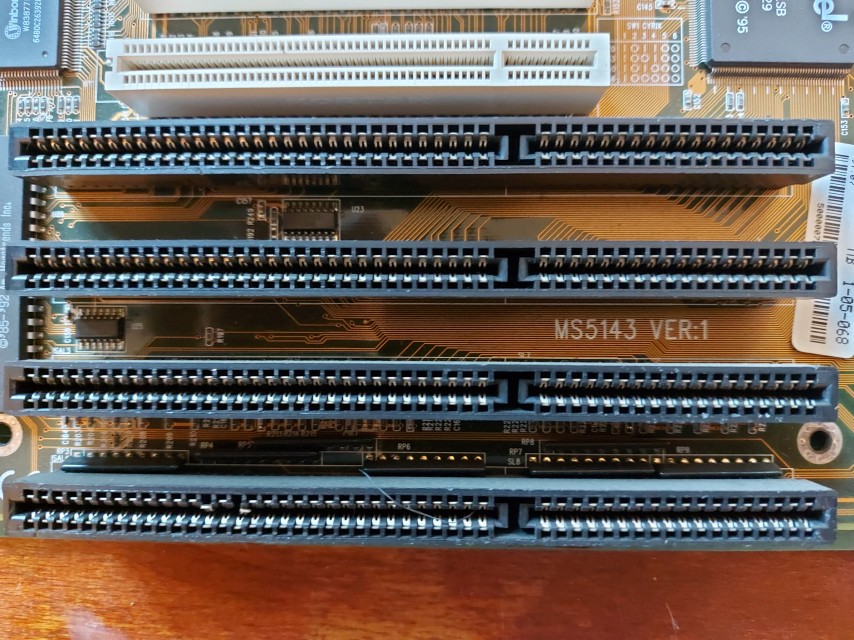 The images below show the much more rare Revision 1 of this board, courtesy of Pawel Jucha. It has the two 168-pin DIMM sockets as well as both an AT and ATX power connector. This implies that the Rev.2 version is possibly a cost-reduced version of the MS-5143.